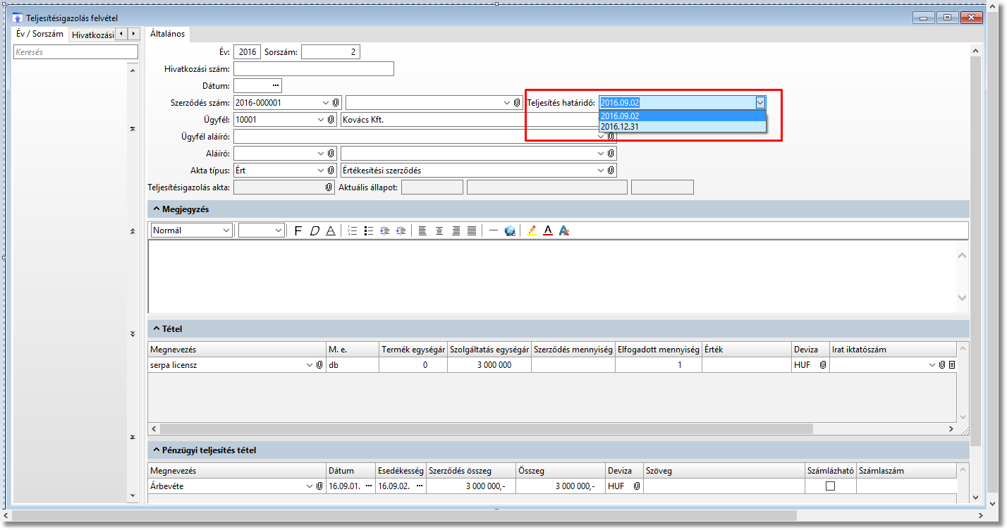 A teljesítésigazolás funkció elindításával a rendszer automatikusan kitölti az ismert adatokat. Nagyon kell figyelnem, hogy a teljesítésigazolásnál a feladat melyik tételét szeretném teljesíteni. Ezt a teljesítés határidő dátumával tudom kiválasztani: