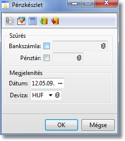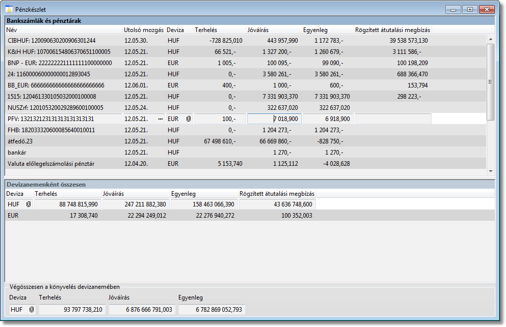 Az eljárás összesíti a pénztárakat és / vagy a bankszámlákat (devizás számlák, vagy valutapénztárak esetén forintos értékeivel együtt). A táblázat sorain nyomott kapcsolódó funkció megmutatja a sorra vonatkozó (Bank/Pénztár) pénzkészlet időrendi kialakulását a kronologikus pénzkészlet funkció meghívásával.
