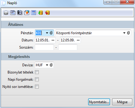 Ha a pénztár mezőben forintos pénztárat adunk meg és kitöltjük a könyvelési devizanemet, akkor a PenztarNaplo2 indul el, amelyen Forgalom, Egyenleg oszlopok jelennek meg a pénztár devizanemében és a párbeszédablakon választott könyvelési devizanemben is.