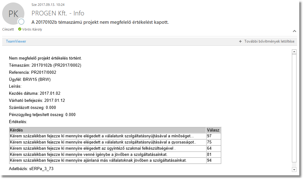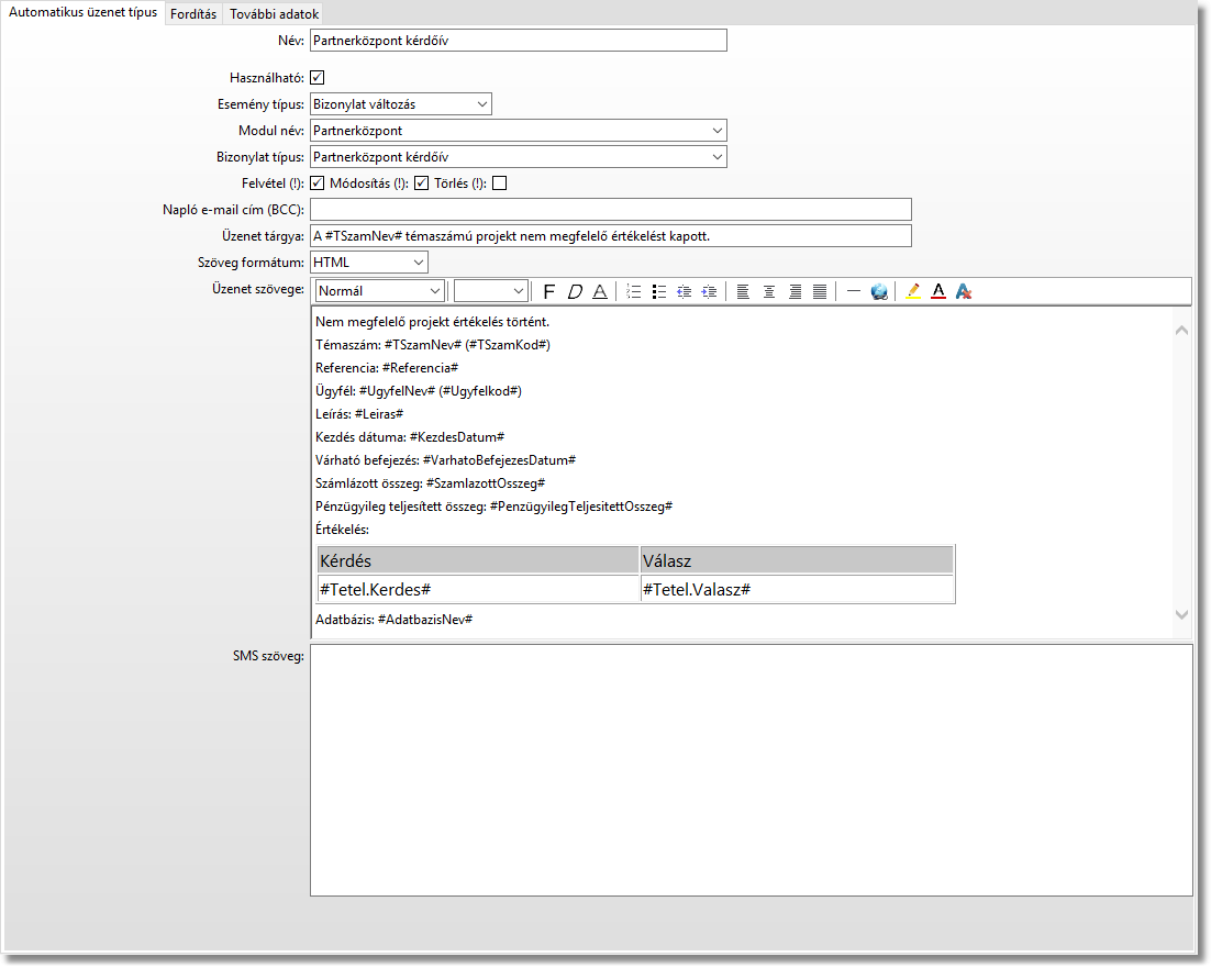 Jelen esetben azt lehet látni, hogy 90% vagy az alatti kérdésekből amennyiben van legalább három darab, akkor kérdőívenként jön az automatikus üzenet, ahogy az most is megtörtént: