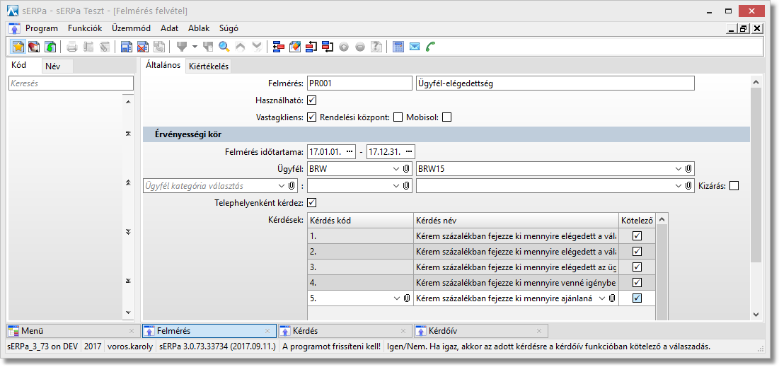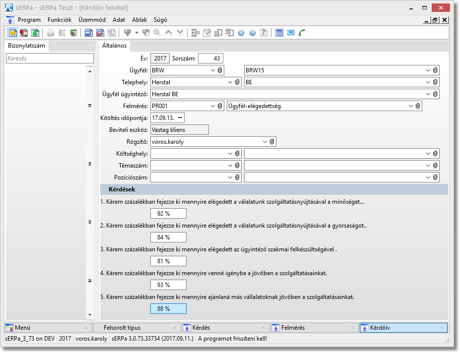 3. lépésben maga a kérdőív kitöltése valósul meg, amit a Kérdőív funkció segítségével történik. Első lépésben ki kell választanunk azt az ügyfelet akire érvényes volt a felmérésben megadott szűrésünk, mivel jelen példában csak egy ügyfél szerepelt a BRW kódú, ezért azt az ügyfelet veszem fel. Az ügyfelemnek két telephelye van, így mindkettőre veszek fel kérdőívet mivel telephely szintű felmérést adtam meg, majd kiválasztom az ügyintézőt, aki válaszol a kérdésekre, és a felmérést amit a 2. lépésben vettem fel. Ahogy elhagyom a felmérés mezőt, megjelennek az általam definiált kérdések, sorrendben, ahogy felvettem, és sárgán, mivel az összes kérdést kötelezőre állítottam. Már csak a kérdések kitöltése van hátra: