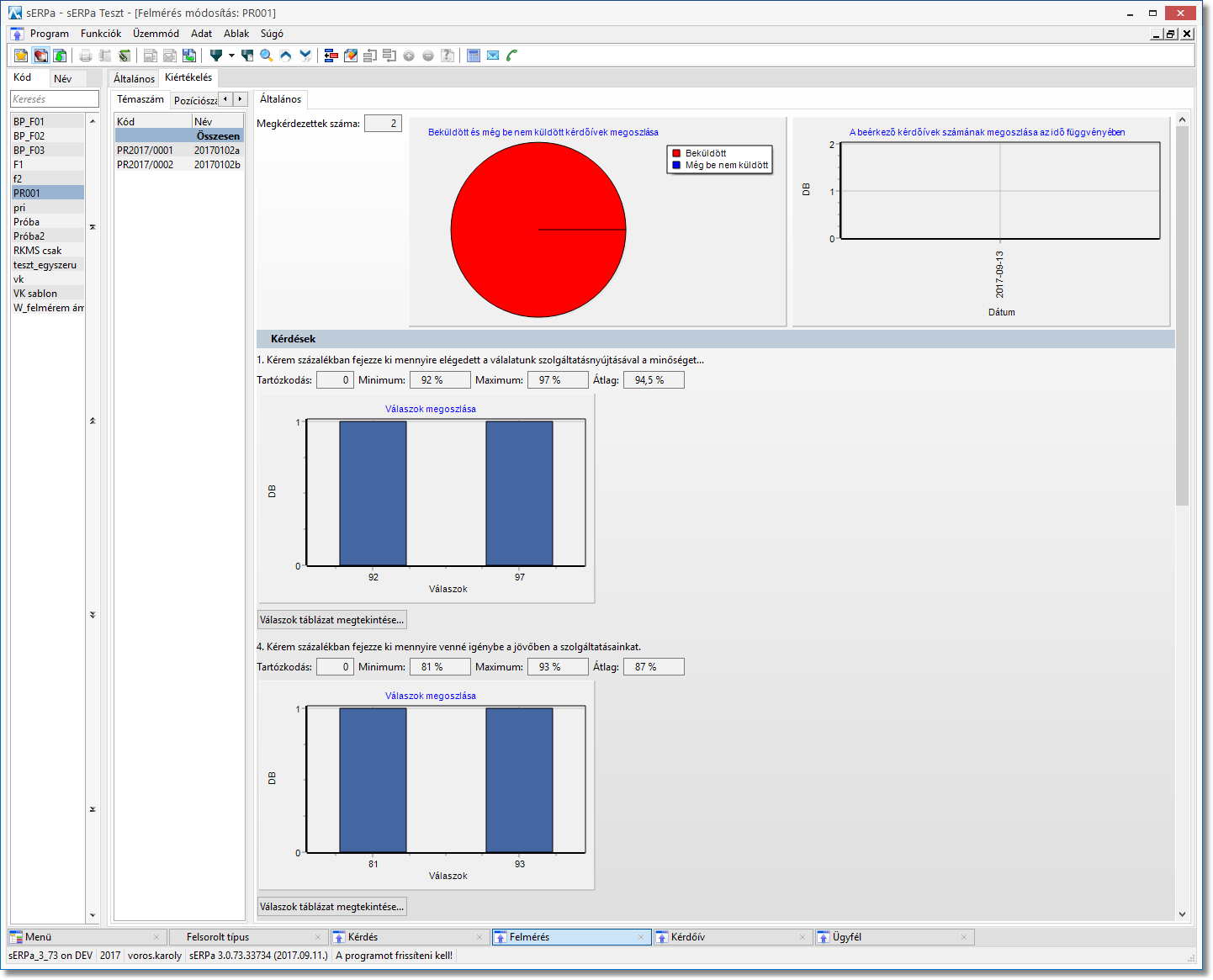 A képen látható, hogy mivel az általunk létrehozott PR001-es felmérésen álok, és a kiértékelés fülön állok, látszik az általam két felvett kérdőív. A kiértékelés bal oldalán a témaszámon állva (a többi keresésen állva is igaz) van egy összesen sor, ez a jelen esetben két kérdőívem összesítése, ahol maximum, minimum, átlag érték látható kérdésenként, valamint még az oldal tetején az, hogy mennyi megkérdező töltötte ki. Jelen esetben az összes két telephely kitöltötte, ezért teljes egész a kördiagram. Amennyiben nem az összesen soron állunk, úgy témaszámonként is megtekinthető a kiértékelés, amennyiben azonos témaszámra veszünk fel azonos felmérést, úgy nem egy sorban összegezve, hanem két sorban külön kerül kiértékelésre, ez igaz költséghely, és pozíciószám esetén is.