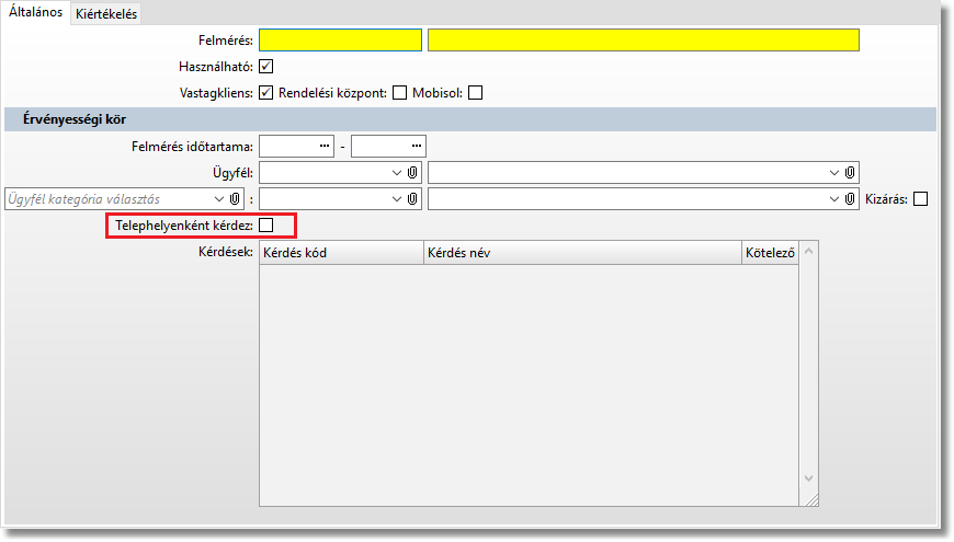 2. lépésben a Felmérés funkcióban lehet megadni, hogy a kérdőívünk milyen kódon és néven legyen elérhető, hol tudjuk kitölteni, a vastag kliens jelenti esetünkben a windowsos Serpát, mikortól meddig lesz aktív, ki a célcsoport, ez lehet egy ügyfél, vagy ügyfélkategória, vagy mindenki közül tudunk ügyfélkategóriát kizárni, de akár mindenki is lehet. Megadhatjuk, hogy amennyiben van az ügyfeleknek telephelyük, akkor telephelyenként kérjük a kérdőív kitöltését, vagy ügyfelenként, ezt egy pipával szabályozhatjuk: