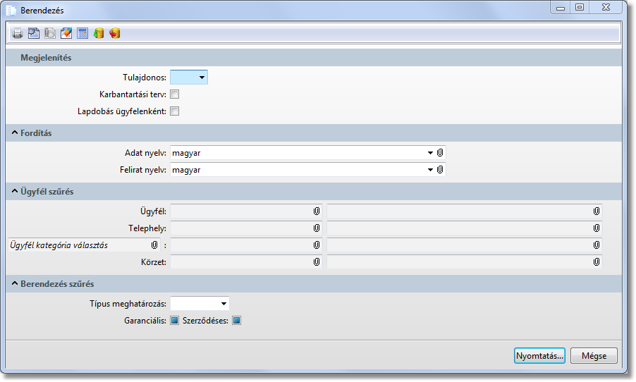 A berendezés lista a berendezés törzsben szereplő berendezések törzslistája tulajdonosonként vagy üzemeltetőként az utolsó javítás a tervezett karbantartás és a szerződésszám feltüntetésével.