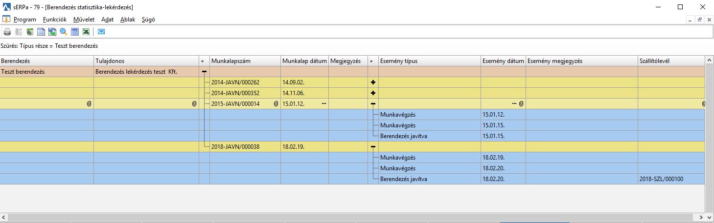 A berendezéstörzsben szereplő berendezések munkalap adatainak szűrésekkel szűkíthető lekérdezésére szolgál, kinyitogatható, táblázatos megjelenítéssel. A szűrések a Párbeszédablakon adhatóak meg, a megjelenített adatok az Eredményképernyőn tekinthetők meg.