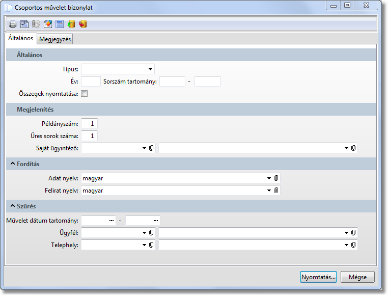 A funkció a csoportos művelettel felvett bizonylatok összesített nyomtatására szolgál, amellyel egyszerre több berendezés átadását, átvételét, cseréjét lehet dokumentálni.