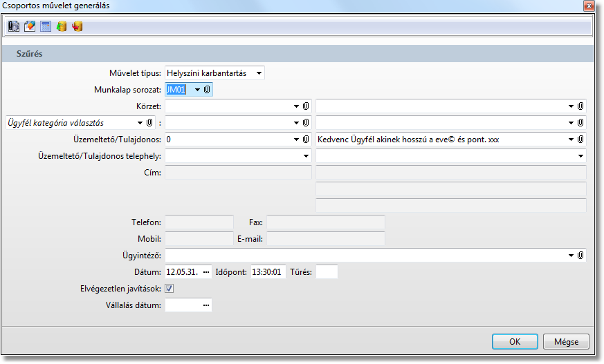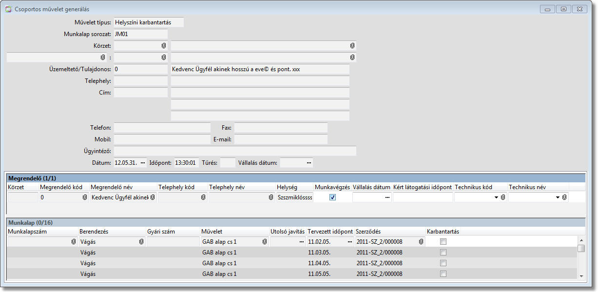 Helyszíni karbantartás: munkalap sorozat, körzet (szűrés), ügyfél kategória + tétel (szűrés), megrendelő (üzemeltető, szűrés), vállalás dátum, tűrés megadása után megjelennek azok a megrendelők (ha meg van adva, akkor üzemeltetők, szükség szerint telephely) és külön táblázatban berendezések, akik a megadott szűréseknek megfelelnek és a megadott dátumtartományban van előjegyezve rendszeres művelet (a megadott kezdő dátumtól számítva kevesebb művelet elvégzését tanúsító munkalap van, mint előjegyzés), vagy amelyikre fel van véve munkavégzés előtt állapotú helyszíni munkalap üres vagy a dátumtartományba eső vállalás dátummal és nem szerepel csoportos műveletben. A megjelenő első táblázat oszlopai: megrendelő (üzemeltető), telephely, munkavégzés (logikai, beviteli mező), vállalás dátum és kért látogatási időpont (beviteli mező, kezdő értéke a szűrésben megadott), technikus (beviteli mező), a másodiké: munkalapszám (előjegyzett rendszeres művelet esetén üres), berendezés, gyári szám, művelet kód, utolsó javítás, tervezett időpont, szerződésszám, munkavégzés (logikai, beviteli mező). Mentés hatására megrendelő (üzemeltető) + telephelyenként csoportos műveletet és megfelelő számú munkalapot generál (a kiválasztott meglévő munkalapokat csak beveszi a csoportba), majd csoportos művelet bizonylatokat nyomtat a program.
