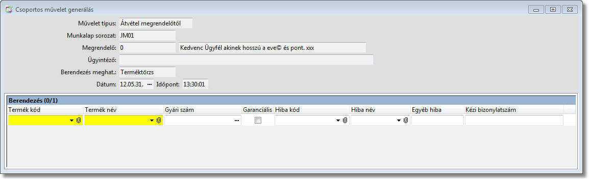 Átvétel megrendelőtől: munkalap sorozat, megrendelő, berendezés meghatározás, munkafelvétel dátum és időpont, valamint táblázatos formában a berendezés, gyári szám, hiba, garanciális mezők megadása. Mentés hatására csoportos műveletet és megfelelő számú munkalapot generál, majd csoportos művelet bizonylatot nyomtat a program.