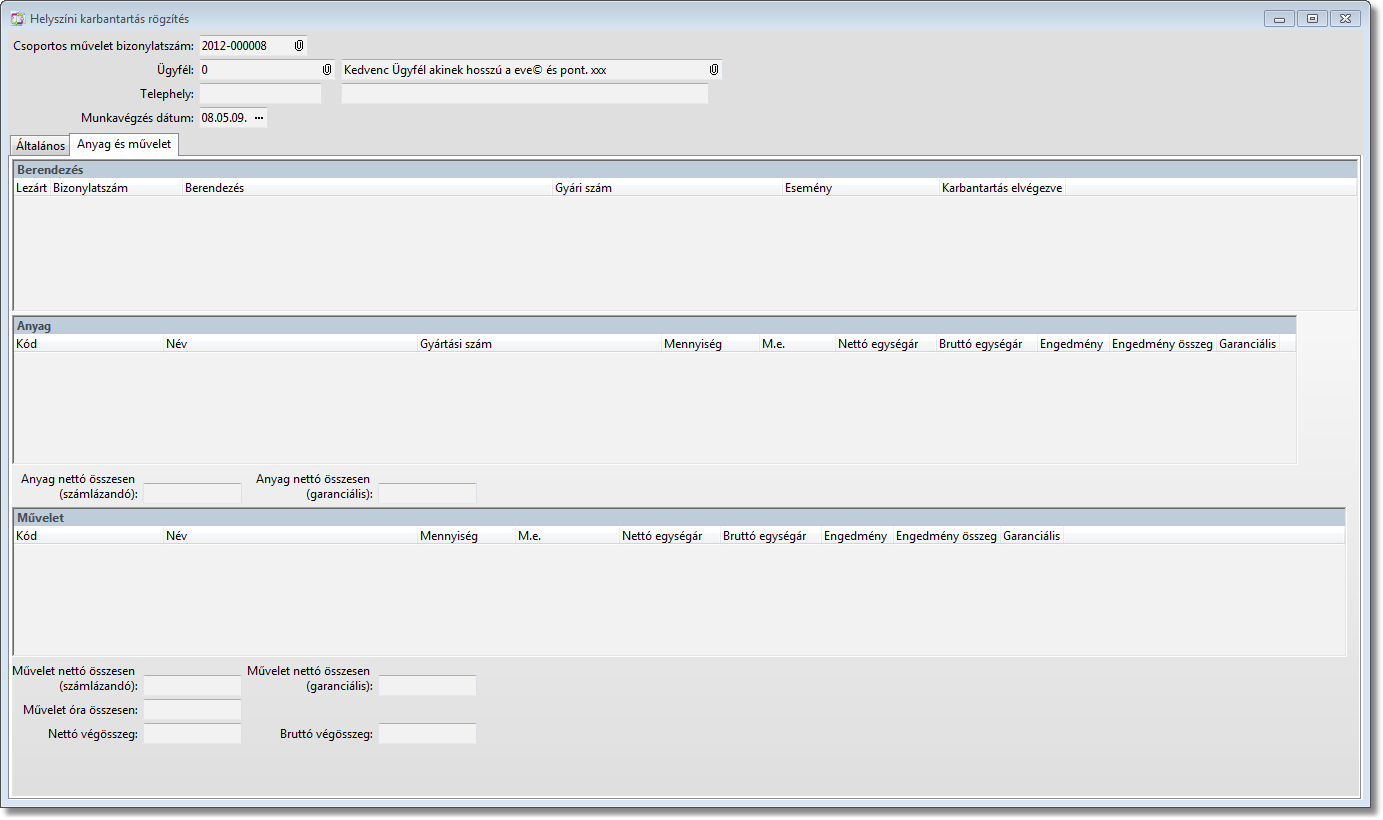 A funkció a „Helyszíni karbantartás” típusú „Csoportos művelet generálás”-sal létrehozott és csoportos bizonylattal kinyomtatott munkalapokkal történt események gyors rögzítésére szolgál.