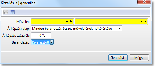 Bekéri a műveletet, az árképzés alapot (Minden berendezés összes műveletének nettó értéke, Kiválasztott berendezés összes műveletének nettó értéke), az árképzés százalékot, és a berendezést (Első, Kiválasztott, Utolsó). A „Generálás” gomb megnyomásakor a megadott berendezéshez a megadott műveletet a program felveszi az árképzés alap és az árképzés százalék alapján kalkulált nettó árral.