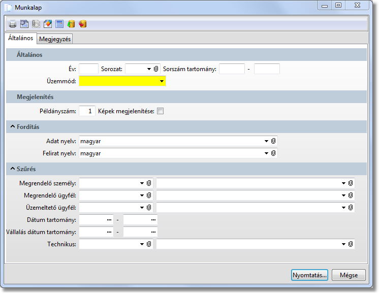 A szerviz munkalapok (ajánlat, javítás munkalap, visszaigazolás, egyéb munkalap) kinyomtatására szolgáló funkció, amely munkalappal a szerelő elmegy a helyszínre és dokumentálja az elvégzett javítás anyag és munka ráfordítását.