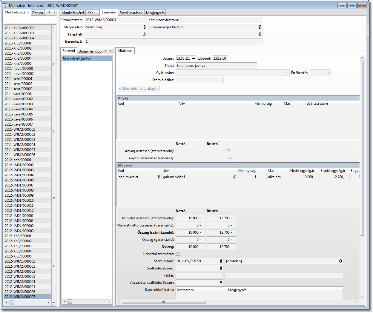 Az elvégzett műveletek helyszíni javítás esetén a „Beszállítás”, „Berendezés javítva”, „Berendezés nem javítható”, „Kiszállítás” eseményeknél megadottak (az utolsó esetben a műhelyben történt javítás műveletei és anyagai – az előzmény munkalap alapján – is a számlára kerülnek), az anyag a „Berendezés javítva” eseménynél megadott. Az elvégzett műveletek és a felhasznált anyagok műhelyben történő javítás esetén a „Munkavégzés”, „Berendezés javítva”, „Berendezés nem javítható” eseményeknél megadottak (az utolsónál csak művelet).