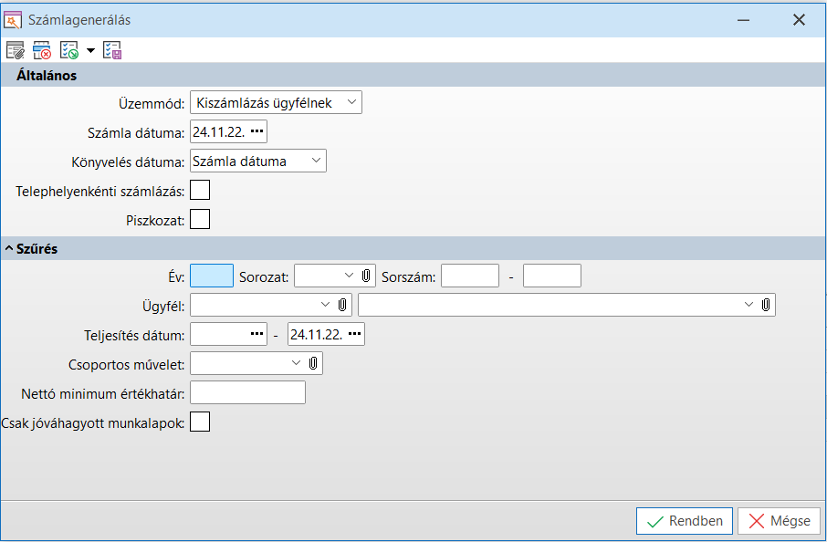 A funkcióval a megadott dátumtartományban felvett munkalapokhoz tartozó számlák generálhatók le.