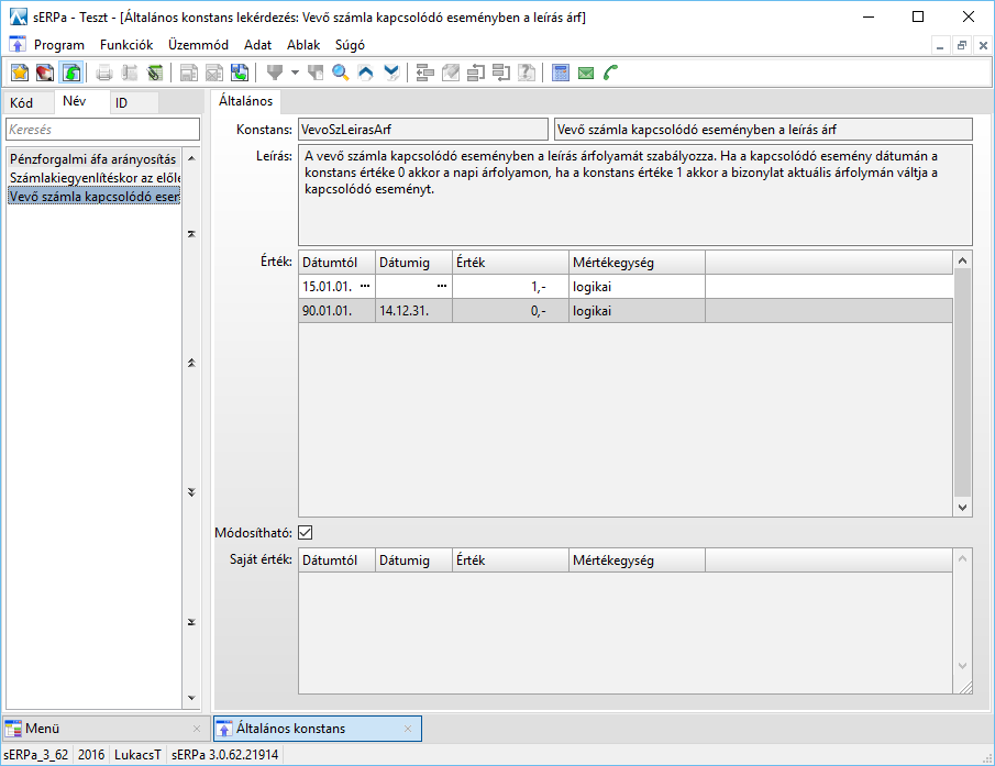 A felhasználó új konstanst nem tud felvenni. A felső (Érték) táblázatban láthatók azok a beállítások amelyeket központilag ad a PROGEN, az alsó (Saját érték) táblázatban a felhasználó által megadott értékek.