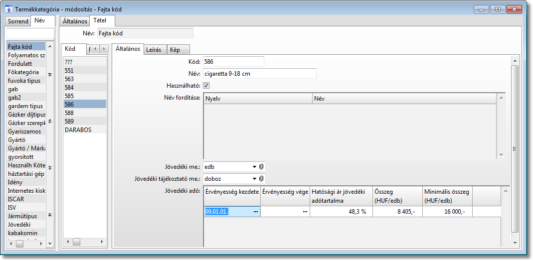 A termékkategória funkció segítségével olyan kategóriákat (pl: termékcsalád-, márkanevek) és hozzájuk tartozó értékeket definiálhatunk, amelyek alapján a forgalmazott termékeinket csoportosítani szeretnénk. A kategóriákkal a kontírozást és a statisztikák készítését könnyíthetjük meg. Ha használjuk az Adóraktár modult is akkor az azzal kapcsolatosan szükséges beállításokról, működésről bővebben a Folymatok haladó felhasználóknak / Adóraktár részben olvashatunk.