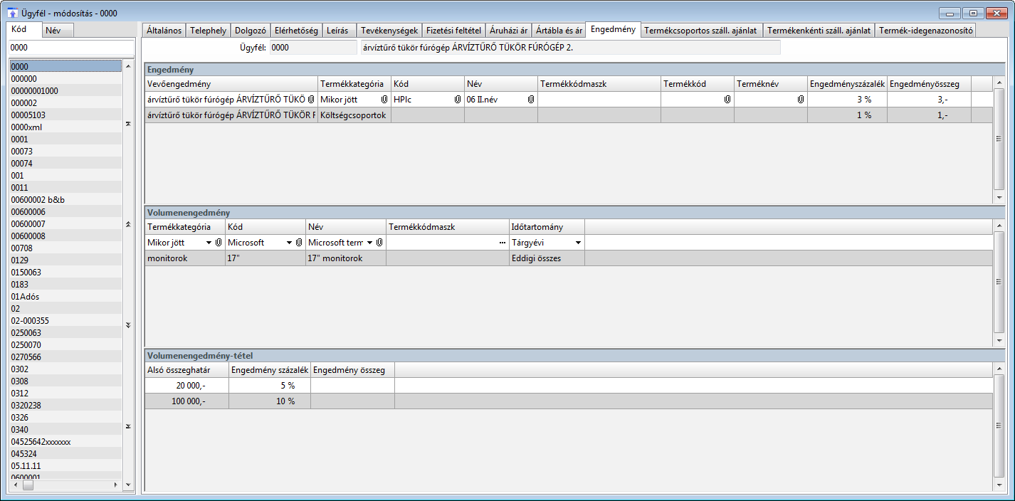 Csak a használható és aznapi dátummal érvényes szerepelnek nem módosítható módon. Új engedmény felvétele, illetve módosítása: Struktúra: Általános: Vevő engedmény A táblázat oszlopai: |