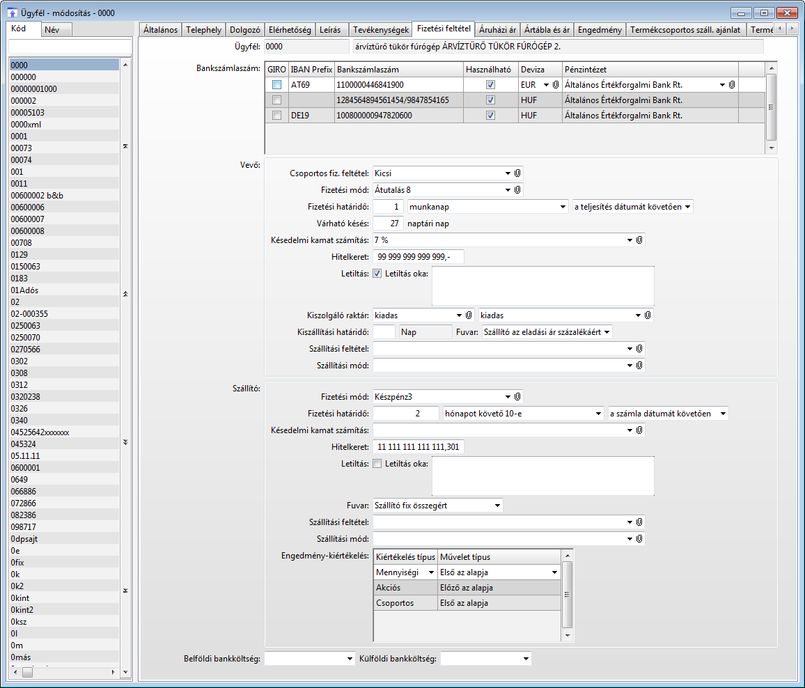 Az ügyfélre vonatkozó fizetési feltételek megadásának a helye. A fül akkor látszik, ha az ügyfél belföldi vevő vagy külföldi vevő.