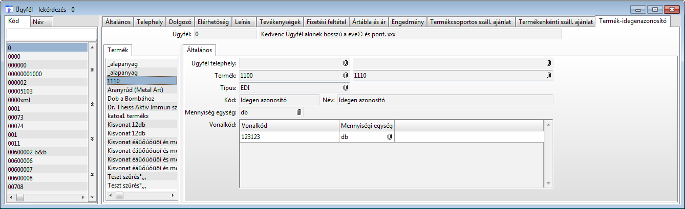 Lehetőség van rögzíteni az egyes termékekre vonatkozóan az adott ügyfél által használt kódokat és megnevezéseket, illetve vonalkódokat.