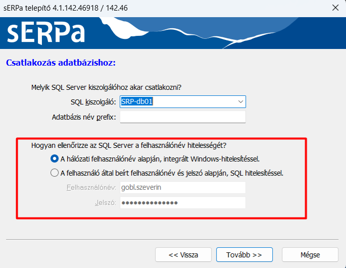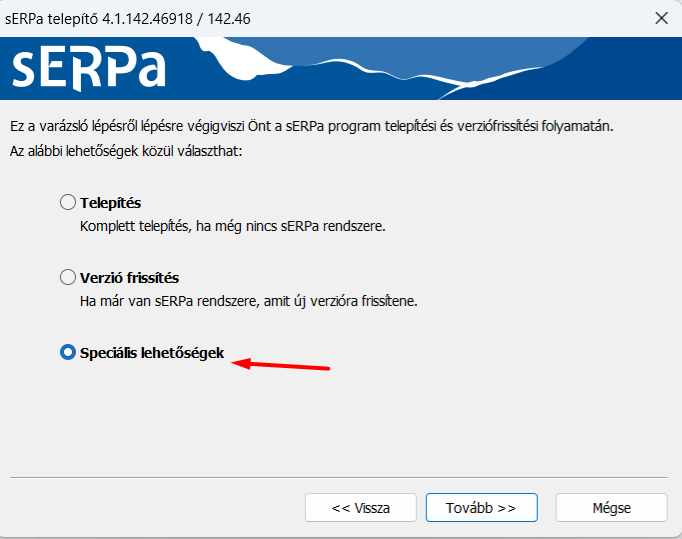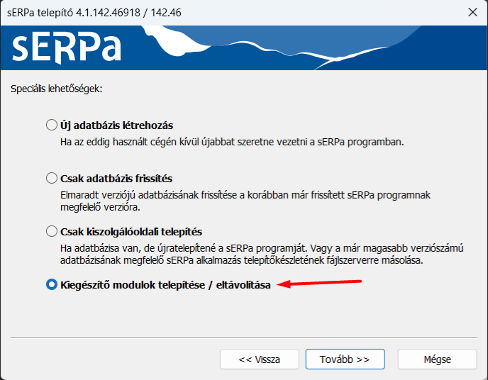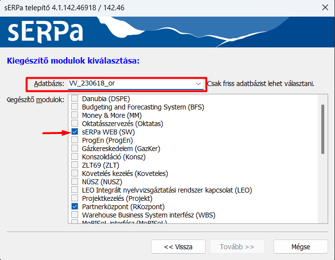 Ezt követően a Speciális lehetőségek -> Kiegészítő modulok telepítése/eltávolítása -> bejelentkezési adatokat megadni -> Kiválasztani az adatbázist, majd a sERPaWeb (SW) modult telepíteni.