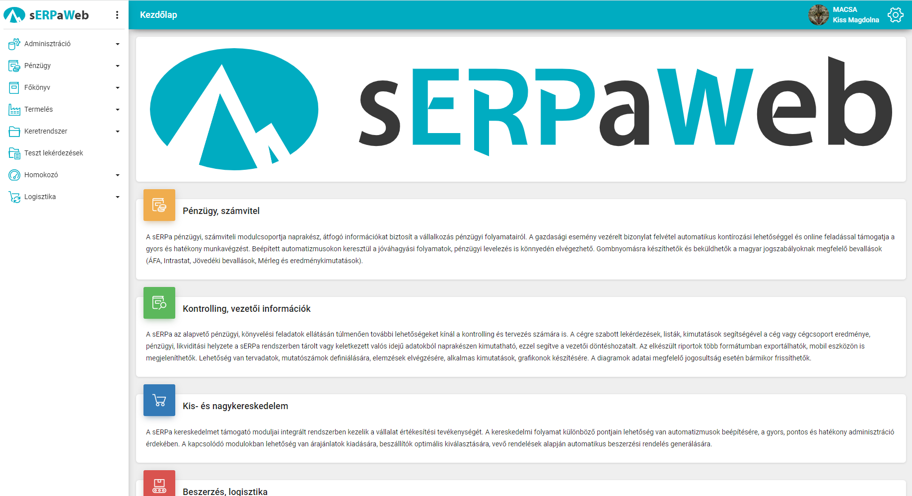 A belépés után megjelenő oldal. A főmenü feletti sERPa Web logóra kattintva tudunk ide visszajutni bárhonnan az oldalon belül.
