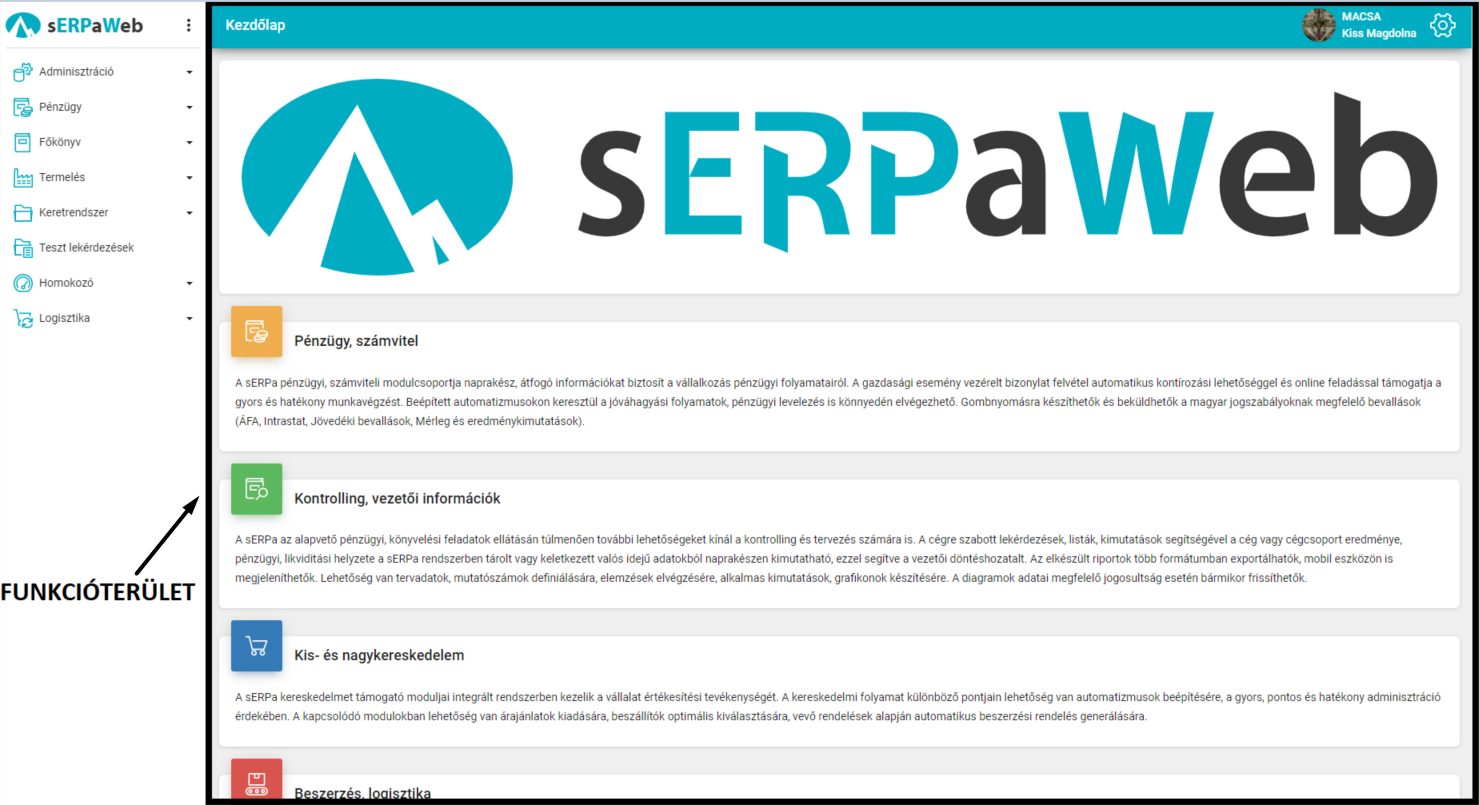 A funkcióterület a fejléc alatti, főmenü melletti rész. Itt találhatóak a különböző főmenü funkciók által elérhető tartalom, ugyanakkor itt tudjuk azokat effektíven használni is.