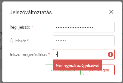 Ezután a Jelszó megerősítése mezőnek egyeznie kell az új jelszó tartalmával, ha nem, figyelmeztetés jelenik meg, illetve ennek is felirata piros lesz: