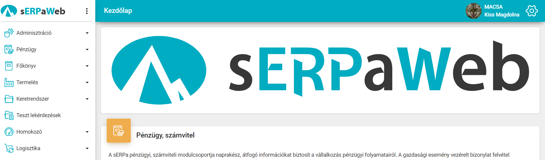 Helye mindig a bal oldalon található, legelső pontja a sERPaWeb logó. Attól függően, hogy milyen eszközről, illetve nézetből tekintjük meg a menünket, összecsukva, illetve kinyitva is megjelenhet bejelentkezés után. Amennyiben összecsukva jelenik meg, egyetlen kattintással ki tudjuk azt nyitni, hogy hozzáférjünk az általunk kívánt területhez. Ugyanez fordítva is igaz, egyszerűen össze tudjuk csukni azt.