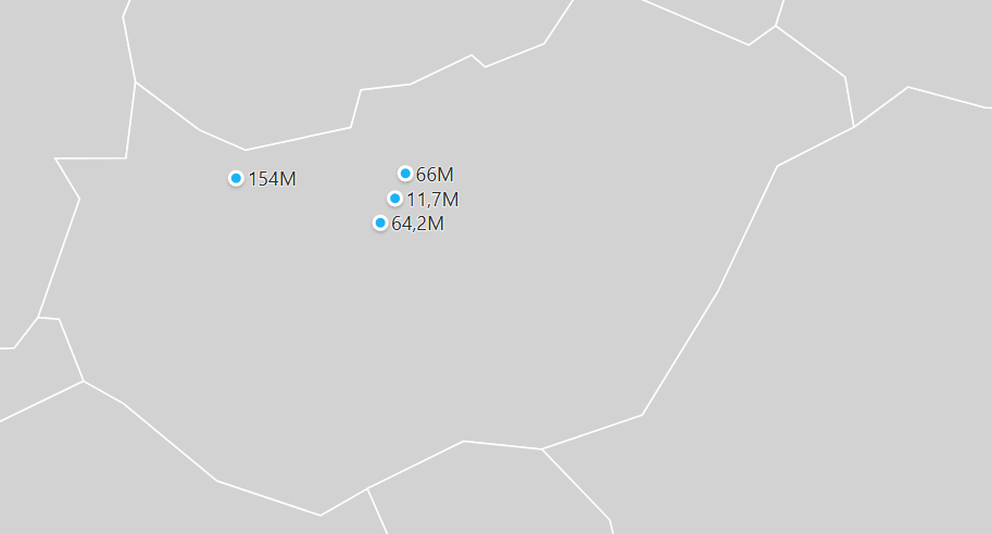 Buboréktérkép A buborékokat földrajzi koordináták segítségével jeleníti meg a térképen. A buborékok különböző adatmennyiséget jelenítenek meg, méretük arányos a megjelenített adatok mennyiségével. |