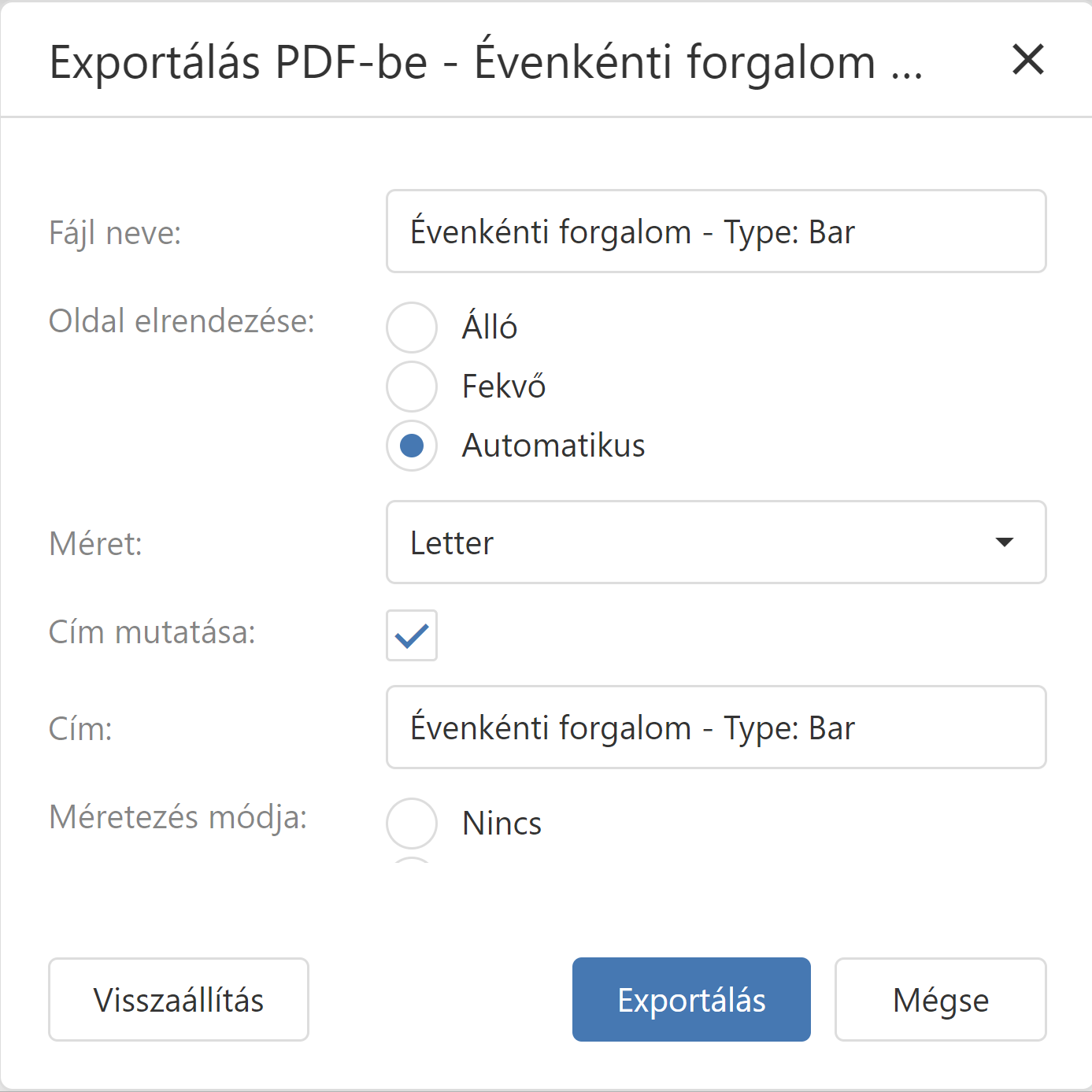 A szükséges paraméterek kiválasztása után az gombra kattintva exportálhatja a diagramot PDF fájlba. Az alapértelmezett értékek visszaállításához kattintson a gombra. |