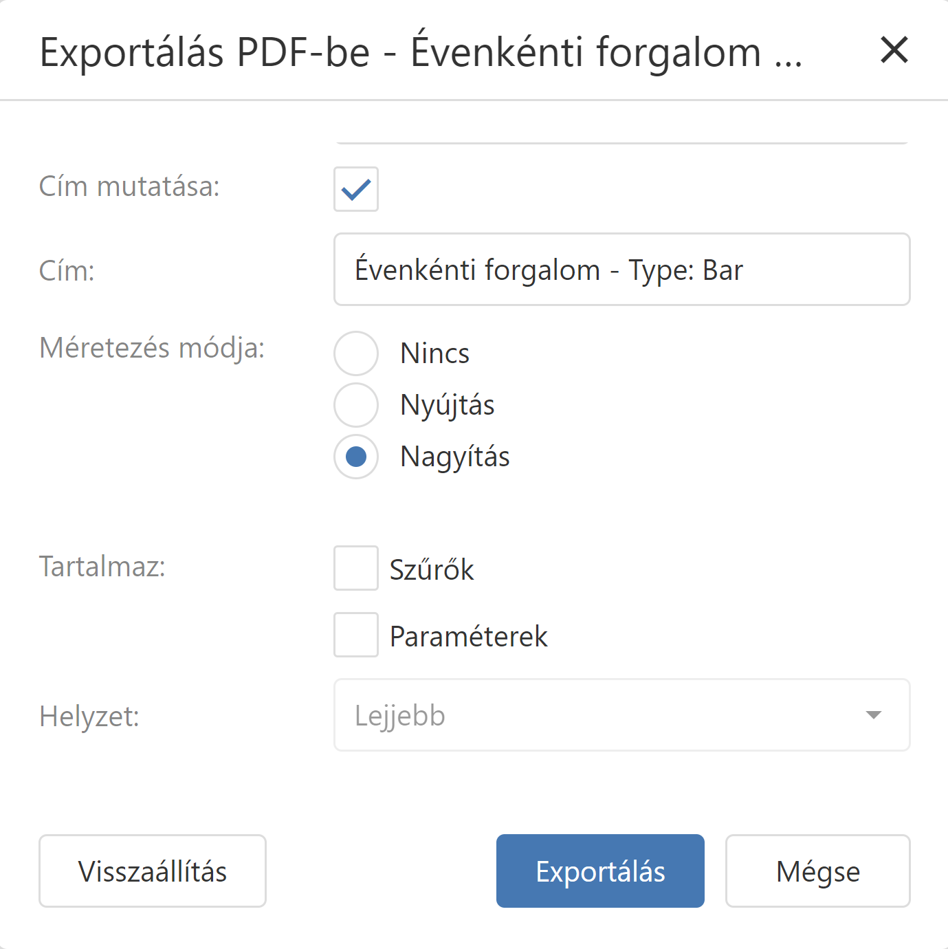 •Fájl neve - Adja meg az exportált PDF fájl nevét. •Oldal elrendezése - Megadhatja a diagram exportálásához használt oldal tájolását. Választhat Álló, Fekvő és Automatikus tájolás között. •Méret - Megadhat papírméretet (a szokásos méretek közül lehet választani, például Letter vagy A4). •Cím mutatása - Jelölje meg, hogy az exportált dokumentumban a diagramnak legyen-e címe. •Cím - Megadhatja az exportált dokumentum címét. Automatikusan megjeleníti a diagram címét, de ezt itt módosíthatja. •Méretezés módja: Megadhatja a méretezés módját a diagram exportálásakor •Tartalmaz | Szűrők - Lehetővé teszi, hogy főszűrő értékeket vegyen fel az exportált dokumentumba. •Tartalmaz | Paraméterek - Lehetővé teszi paraméter-értékek felvételét az exportált dokumentumba. •Helyzet - Megadhatja a Szűrők és a Paraméterek helyzetét az exportált dokumentumban. Választható Lejjebb és Külön oldal.