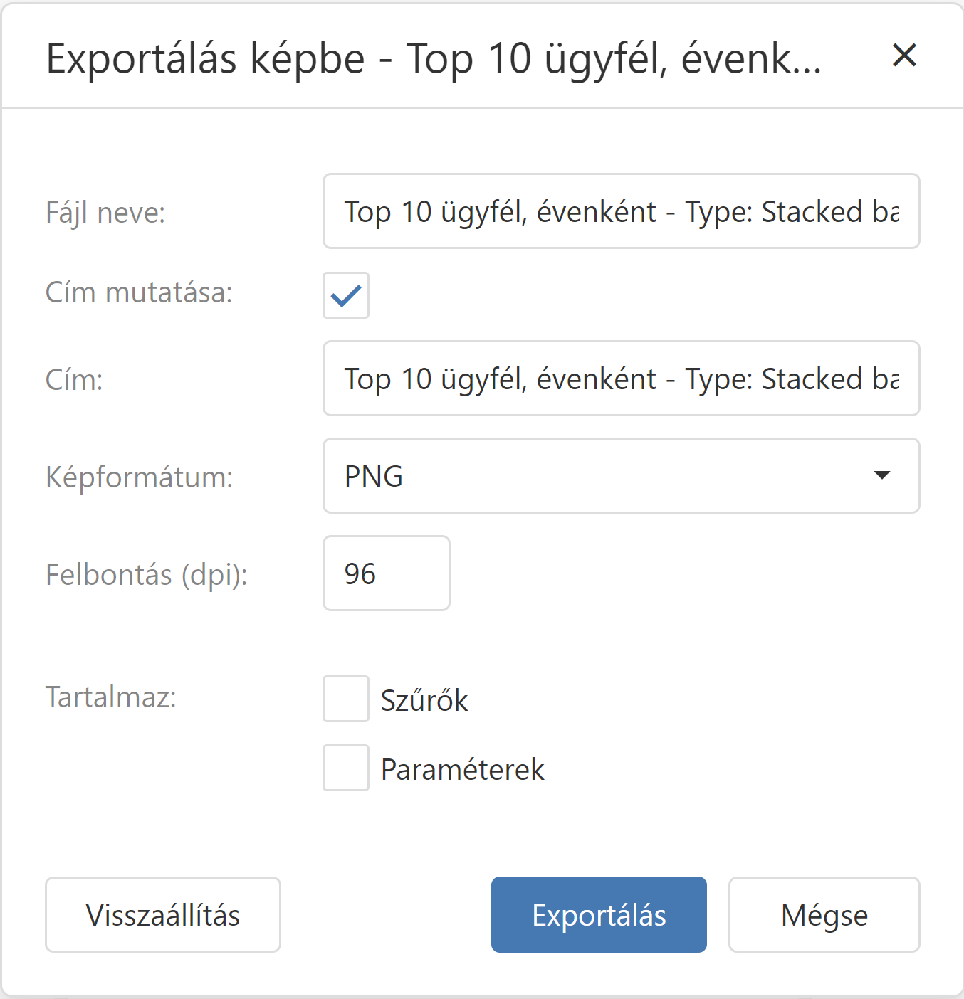 •Fájl neve - Adja meg az exportált kép fájl nevét. •Cím mutatása - Jelölje meg, hogy az exportált dokumentumban a diagramnak legyen-e címe. •Cím - Megadhatja az exportált dokumentum címét. Automatikusan megjeleníti a diagram címét, de ezt itt módosíthatja. •Képformátum - Megadhatja azt a képformátumot, amelyben a diagramot exportáljuk. A következő formátumok állnak rendelkezésre: PNG, JPEG és GIF. •Felbontás (dpi) - Megadhatja a diagram exportálásához használt felbontást (dpi-ben). •Tartalmaz | Szűrők - Lehetővé teszi, hogy főszűrő értékeket vegyen fel az exportált dokumentumba. •Tartalmaz | Paraméterek - Lehetővé teszi paraméterértékek felvételét az exportált dokumentumba.