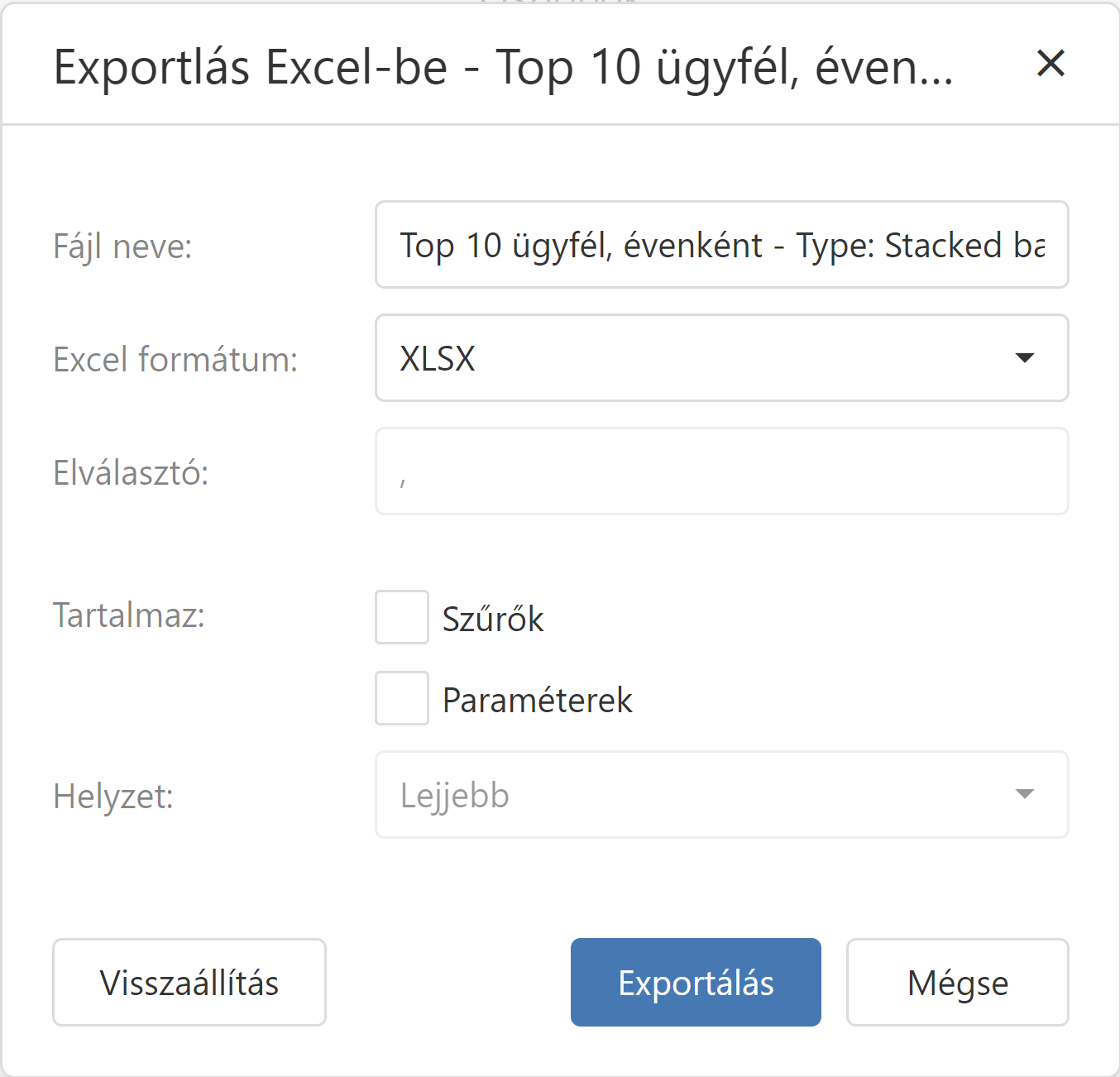 •Fájl neve - Adja meg az exportált Excel fájl nevét. •Excel formátum - Megadhatja az Excel munkafüzet formátumot, amelyben a diagram adatait exportáljuk. Választhat az XLSX és az XLS formátumok között. •Elválasztó - CSV fájl esetén megadhatja, hogy milyen karakterrel legyenek elválasztva az értékek •Tartalmaz | Szűrők - Lehetővé teszi, hogy főszűrő értékeket vegyen fel az exportált dokumentumba. •Tartalmaz | Paraméterek - Lehetővé teszi paraméterértékek felvételét az exportált dokumentumba. •Helyzet - Megadhatja a Szűrők és a Paraméterek helyzetét az exportált dokumentumban. Választható Lejjebb és Külön oldal.