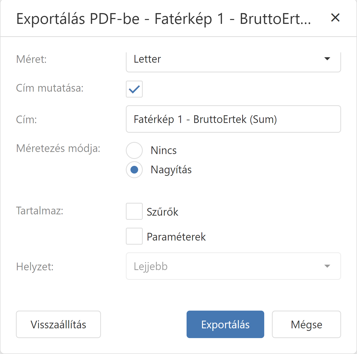 •Fájl neve - Adja meg az exportált PDF fájl nevét. •Oldal elrendezése - Megadhatja a Fatérkép exportálásához használt oldal tájolását. Választhat Álló, Fekvő és Automatikus tájolás között. •Méret - Megadhat papírméretet (a szokásos méretek közül lehet választani, például Letter vagy A4). •Cím mutatása - Ha szeretné, hogy az exportált dokumentumban a Fatérképnek legyen címe, akkor tegyen pipát a kis négyzetbe. •Cím - Megadhatja az exportált dokumentum címét. Automatikusan megjeleníti a Fatérkép címét, de ezt itt módosíthatja. •Méretezés módja - Megadhatja a méretezés módját a Fatérkép exportálásakor. •Tartalmaz | Szűrők - Lehetővé teszi, hogy főszűrő értékeket vegyen fel az exportált dokumentumba. •Tartalmaz | Paraméterek - Lehetővé teszi paraméterértékek felvételét az exportált dokumentumba. •Helyzet - Megadhatja a Szűrők és a Paraméterek helyzetét az exportált dokumentumban. Választható Lejjebb és Külön oldal.