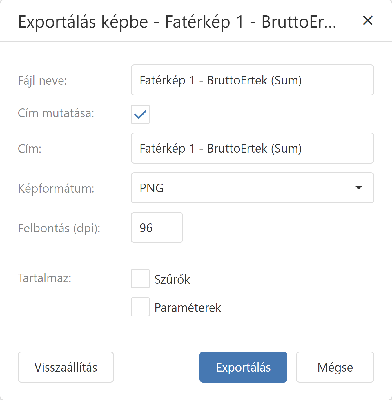 •Fájl neve - Adja meg az exportált kép fájl nevét. •Cím mutatása - Ha szeretné, hogy az exportált dokumentumban a Fatérképnek legyen címe, akkor tegyen pipát a kis négyzetbe. •Cím - Megadhatja az exportált dokumentum címét. Automatikusan megjeleníti a Fatérkép címét, de ezt itt módosíthatja. •Képformátum - Megadhatja azt a képformátumot, amelyben a Fatérképet exportáljuk. A következő formátumok állnak rendelkezésre: PNG, JPEG és GIF. •Felbontás (dpi) - Megadhatja a Fatérképt exportálásához használt felbontást (dpi-ben). •Tartalmaz | Szűrők - Lehetővé teszi, hogy főszűrő értékeket vegyen fel az exportált dokumentumba. •Tartalmaz | Paraméterek - Lehetővé teszi paraméterértékek felvételét az exportált dokumentumba.