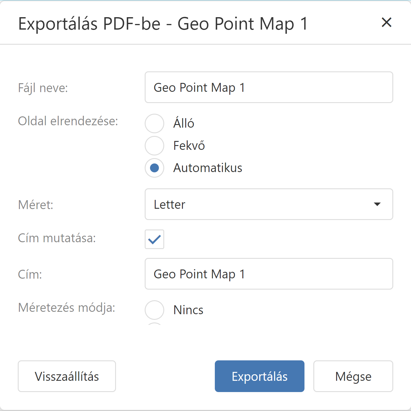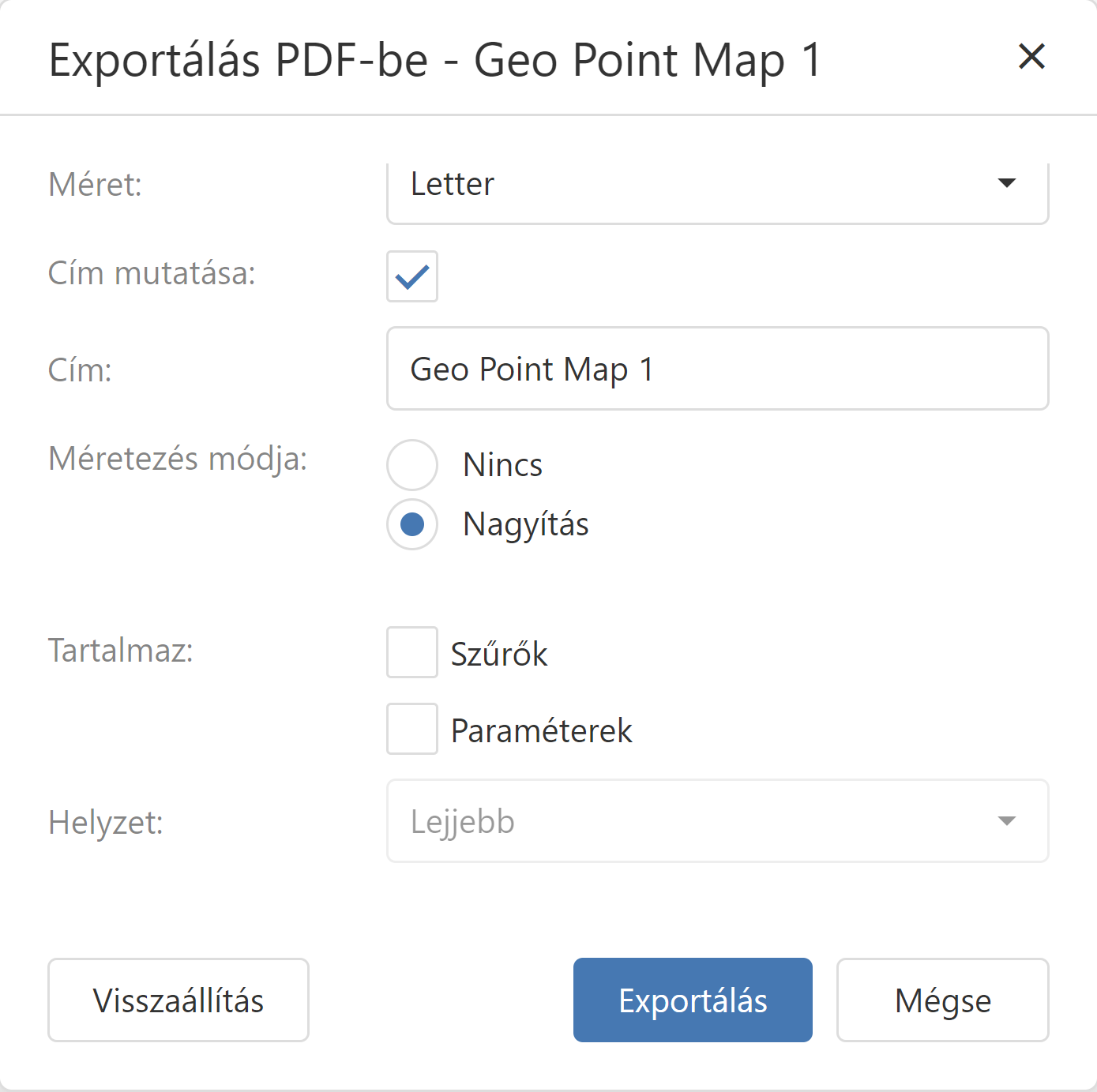 A szükséges paraméterek kiválasztása után az gombra kattintva exportálhatja a Földrajzi pont térképet PDF fájlba. Az alapértelmezett értékek visszaállításához kattintson a gombra. |