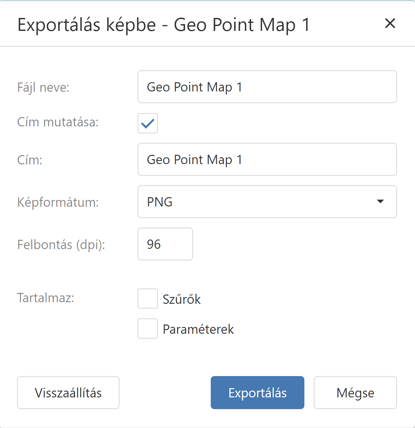 A szükséges paraméterek kiválasztása után az gombra kattintva exportálhatja a Földrajzi pont térképet képként. Az alapértelmezett értékek visszaállításához kattintson a gombra. |