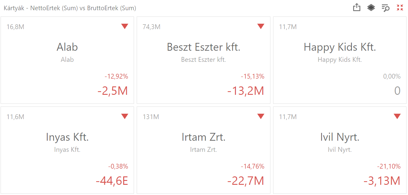 A Kártyákkal lehetősége van van egy adott értéket megjeleníteni Kártyán vagy akár két érték összehasonlítását és a különbséget is vizualizálni. A különbségeket megjeleníthetjük százalékosan és abszolút értékként is. |