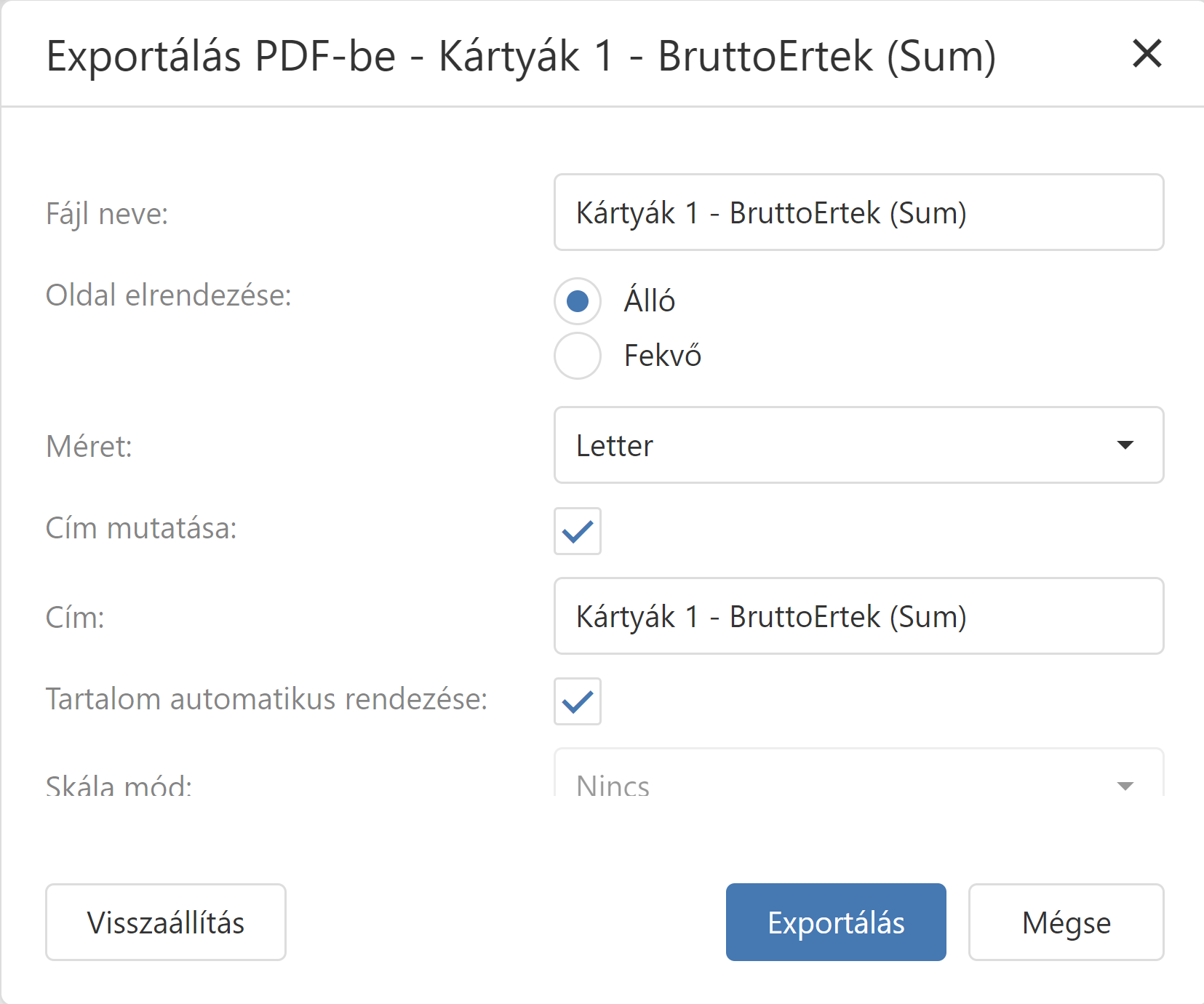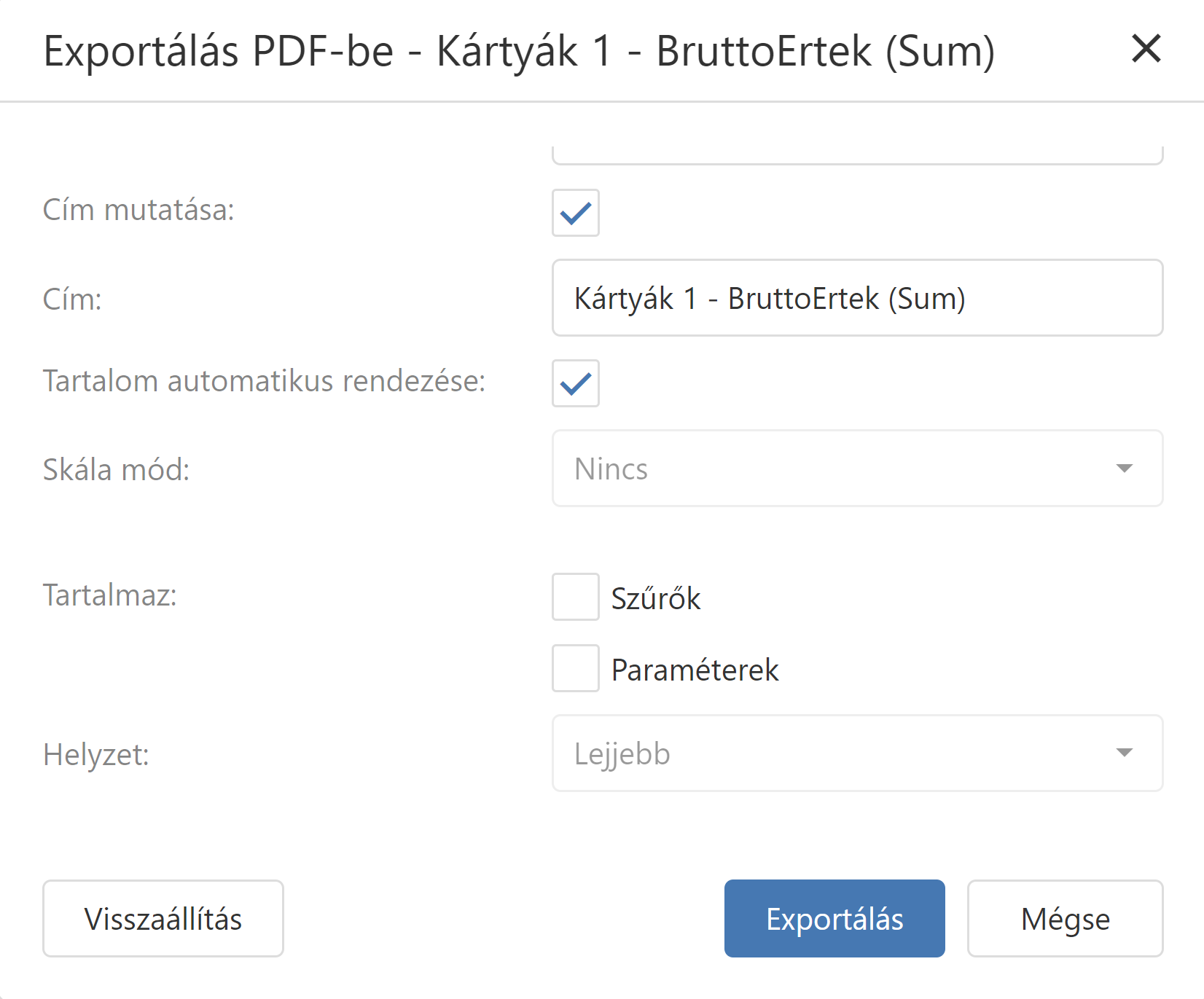 •Fájl neve - Adja meg az exportált PDF fájl nevét. •Oldal elrendezése - Megadhatja a Kártyák exportálásához használt oldal tájolását. Választhat Álló és Fekvő tájolás között. •Méret - Megadhat papírméretet (a szokásos méretek közül lehet választani, például Letter vagy A4). •Cím mutatása - Ha szeretné, hogy az exportált dokumentumban a Kártyáknak legyen címe, akkor tegyen pipát a kis négyzetbe. •Cím - Megadhatja az exportált dokumentum címét. Automatikusan megjeleníti a Kártyák címét, de ezt itt módosíthatja. •Tartalom automatikus rendezése - •Skála mód - Megadhatja a méretezés módját a Kártyák exportálásakor. Használhat skála tényezőt, vagy automatikus igazítást. •Tartalmaz | Szűrők - Lehetővé teszi, hogy főszűrő értékeket vegyen fel az exportált dokumentumba. •Tartalmaz | Paraméterek - Lehetővé teszi paraméterértékek felvételét az exportált dokumentumba. •Helyzet - Megadhatja a Szűrők és a Paraméterek helyzetét az exportált dokumentumban. Választható Lejjebb és Külön oldal.