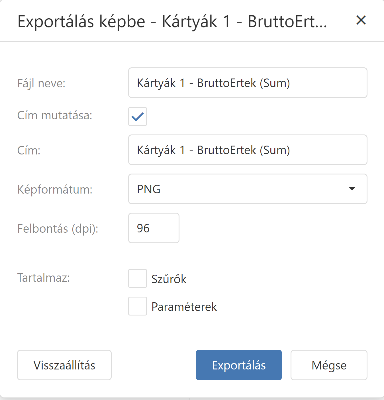 •Fájl neve - Adja meg az exportált kép fájl nevét. •Cím mutatása - Ha szeretné, hogy az exportált dokumentumban a Kártyáknak legyen címe, akkor tegyen pipát a kis négyzetbe. •Cím - Megadhatja az exportált dokumentum címét. Automatikusan megjeleníti a Kártyák címét, de ezt itt módosíthatja. •Képformátum - Megadhatja azt a képformátumot, amelybe Kártyákat exportáljuk. A következő formátumok állnak rendelkezésre: PNG, JPEG és GIF. •Felbontás (dpi) - Megadhatjad a Kártyák exportálásához használt felbontást (dpi-ben). •Tartalmaz | Szűrők - Lehetővé teszi, hogy főszűrő értékeket vegyen fel az exportált dokumentumba. •Tartalmaz | Paraméterek - Lehetővé teszi paraméterértékek felvételét az exportált dokumentumba.