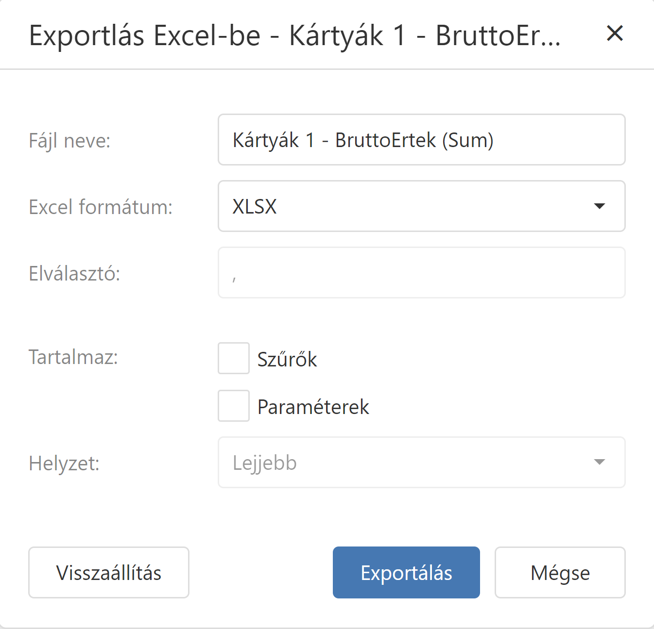 •Fájl neve - Adja meg az exportált Excel fájl nevét. •Excel formátum - Megadhatja az Excel munkafüzet formátumot, amelybe Kártyákat adatait exportáljuk. Választhat az XLSX és az XLS formátumok között. •Elválasztó - CSV fájl esetén megadhatja, hogy milyen karakterrel legyenek elválasztva az értékek •Tartalmaz | Szűrők - Lehetővé teszi, hogy főszűrő értékeket vegyen fel az exportált dokumentumba. •Tartalmaz | Paraméterek - Lehetővé teszi paraméterértékek felvételét az exportált dokumentumba. •Helyzet - Megadhatja a Szűrők és a Paraméterek helyzetét az exportált dokumentumban. Választható Lejjebb és Külön oldal.