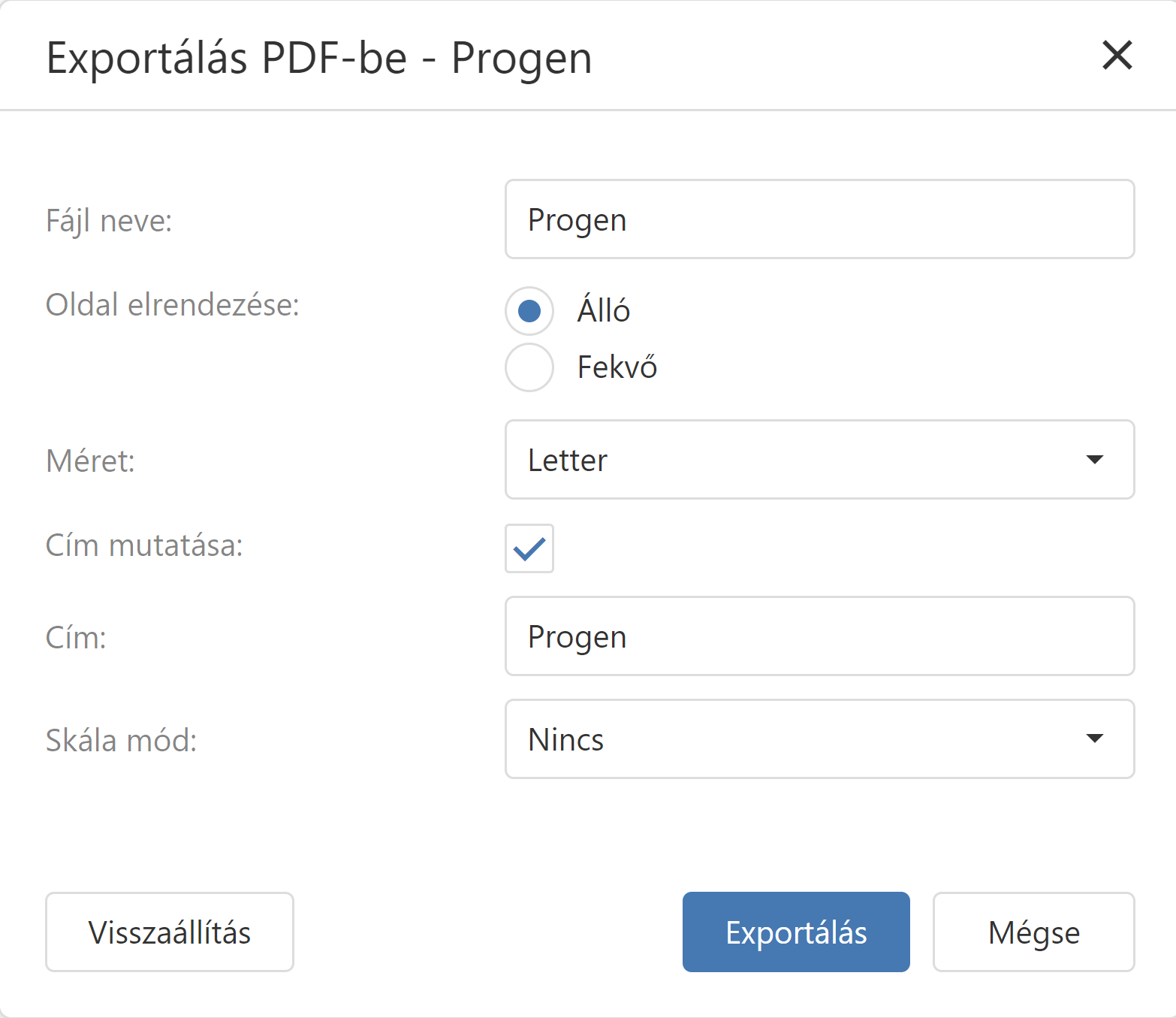 A szükséges paraméterek kiválasztása után az gombra kattintva exportálhatja a Képet PDF fájlba. Az alapértelmezett értékek visszaállításához kattintson a gombra. |