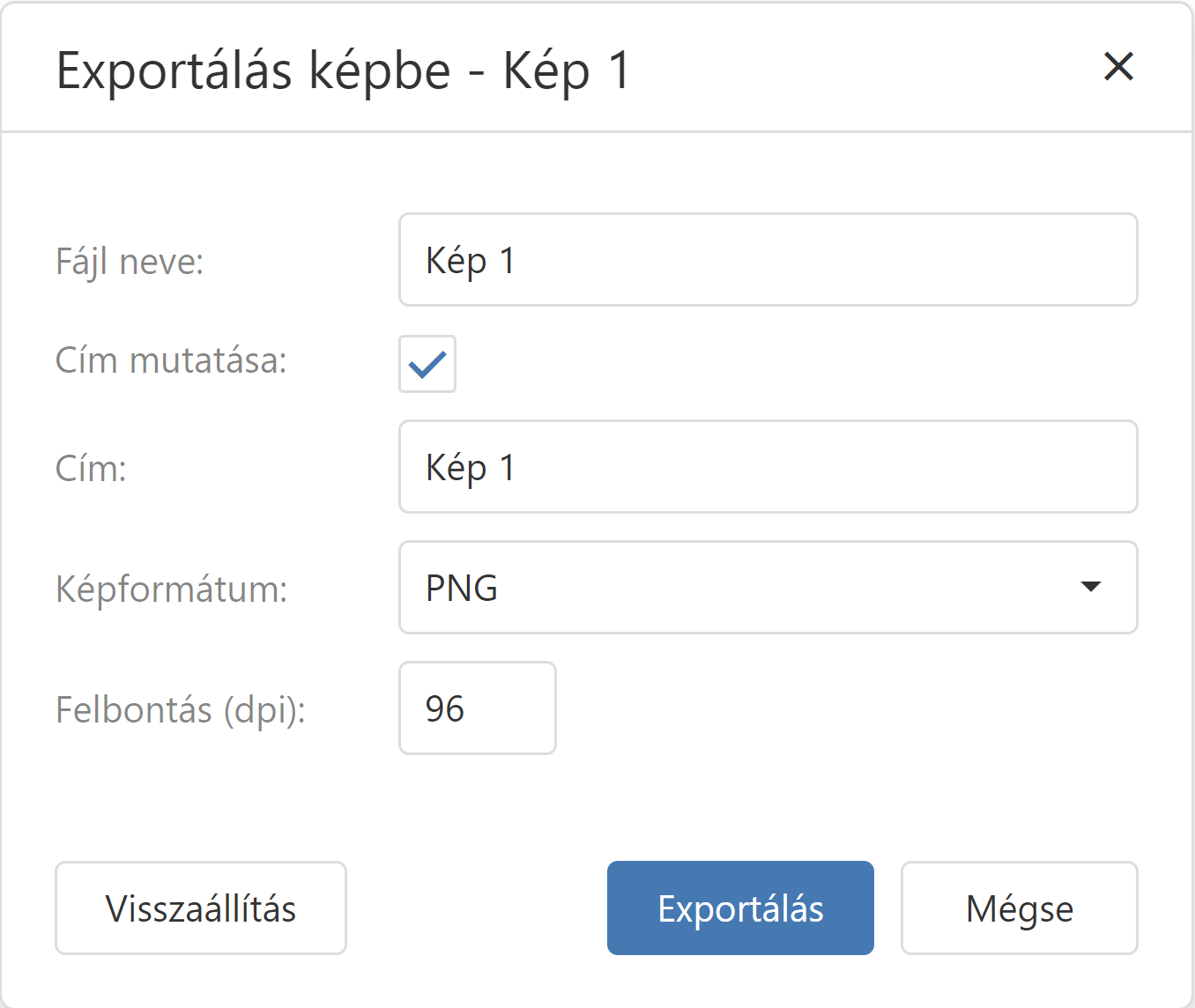 A szükséges paraméterek kiválasztása után az gombra kattintva exportálhatja a Képet képként. Az alapértelmezett értékek visszaállításához kattintson a gombra. |