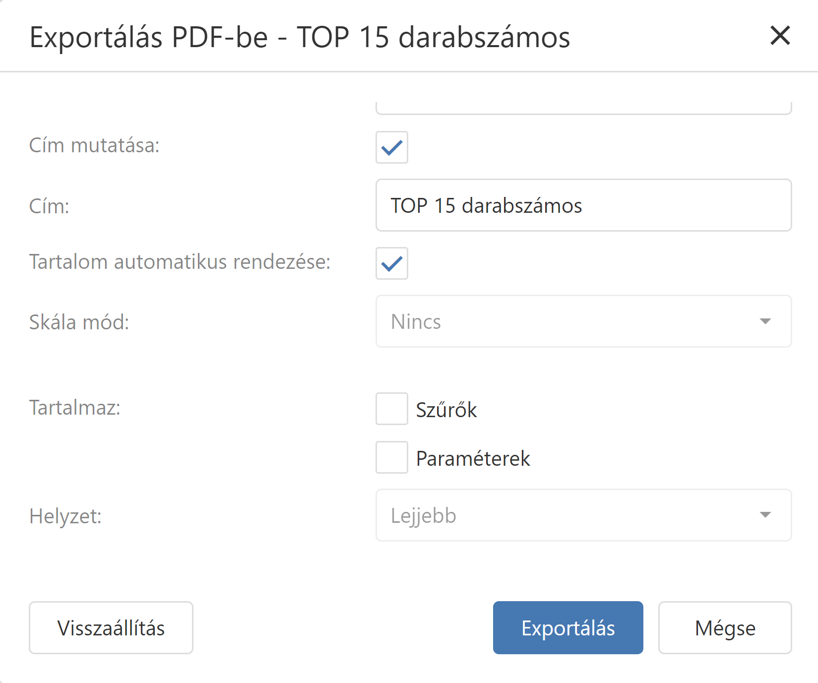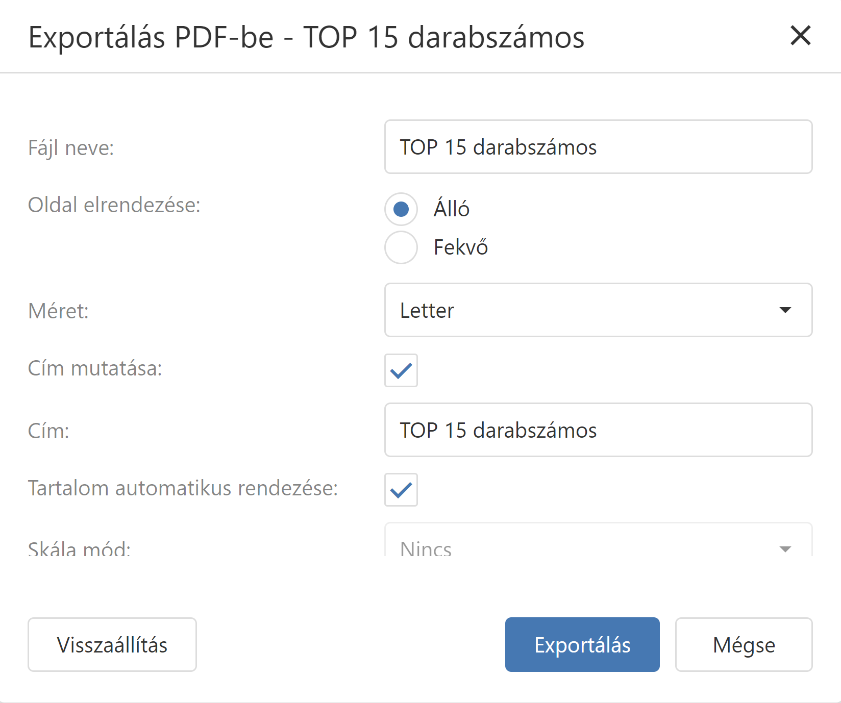 A szükséges paraméterek kiválasztása után az gombra kattintva exportálhatja a kördiagramot PDF fájlba. Az alapértelmezett értékek visszaállításához kattintson a gombra. |