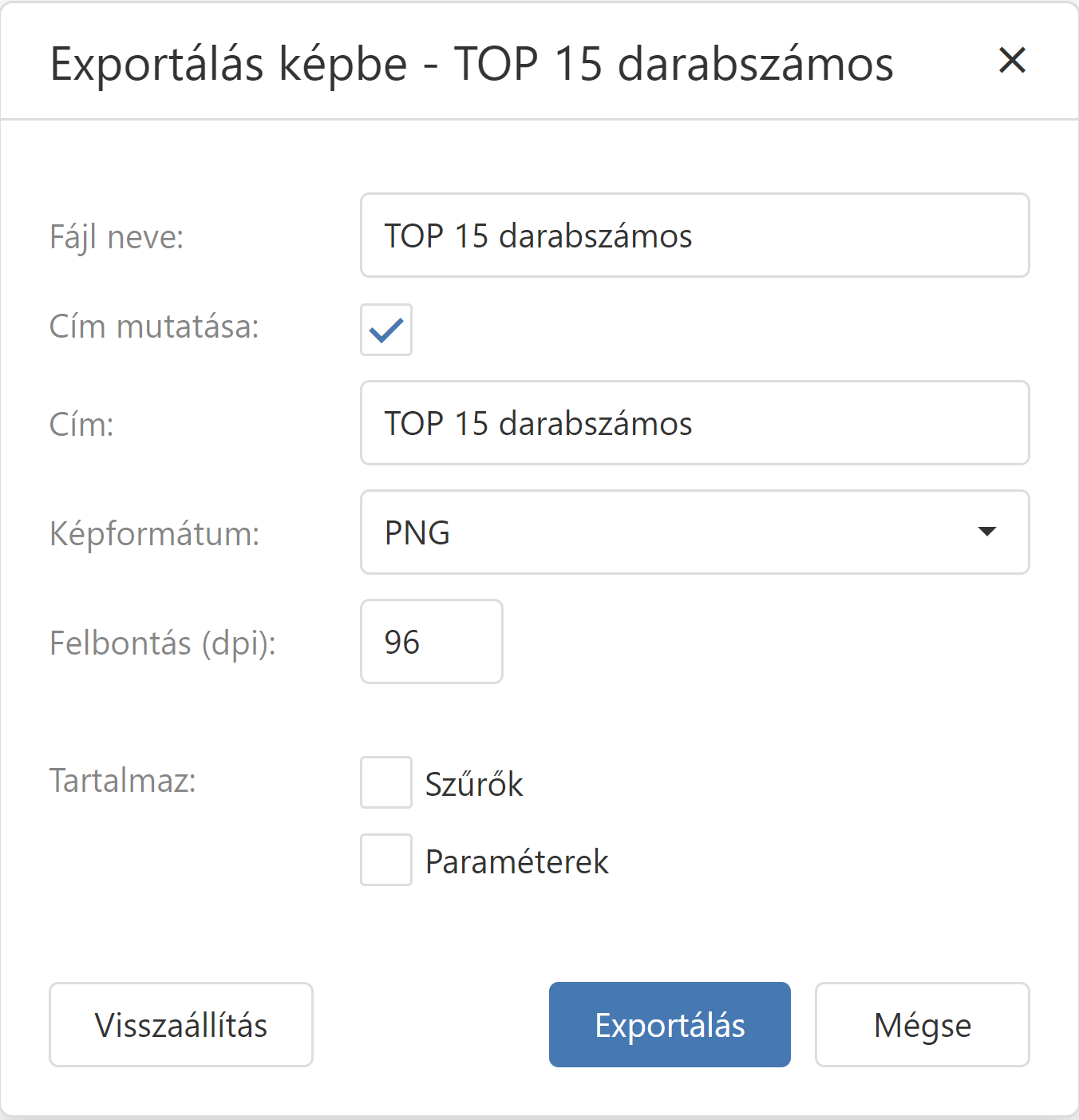 A szükséges paraméterek kiválasztása után az gombra kattintva exportálhatja a kördiagramot képként. Az alapértelmezett értékek visszaállításához kattintson a gombra. |