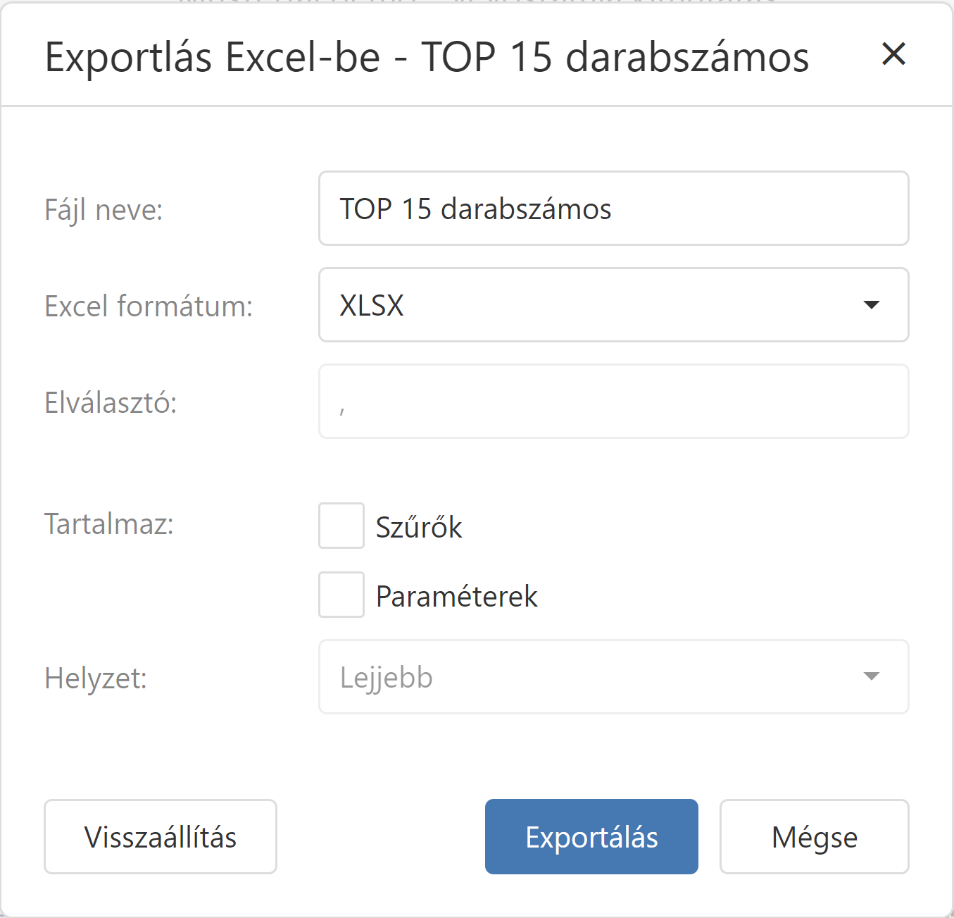 •Fájl neve - Adja meg az exportált Excel fájl nevét. •Excel formátum - Megadhatja az Excel munkafüzet formátumot, amelybe a Kördiagram adatait exportáljuk. Választhat az XLSX és az XLS formátumok között. •Elválasztó - CSV fájl esetén megadhatja, hogy milyen karakterrel legyenek elválasztva az értékek •Tartalmaz | Szűrők - Lehetővé teszi, hogy főszűrő értékeket vegyen fel az exportált dokumentumba. •Tartalmaz | Paraméterek - Lehetővé teszi paraméterértékek felvételét az exportált dokumentumba. •Helyzet - Megadhatja a Szűrők és a Paraméterek helyzetét az exportált dokumentumban. Választható Lejjebb és Külön oldal.