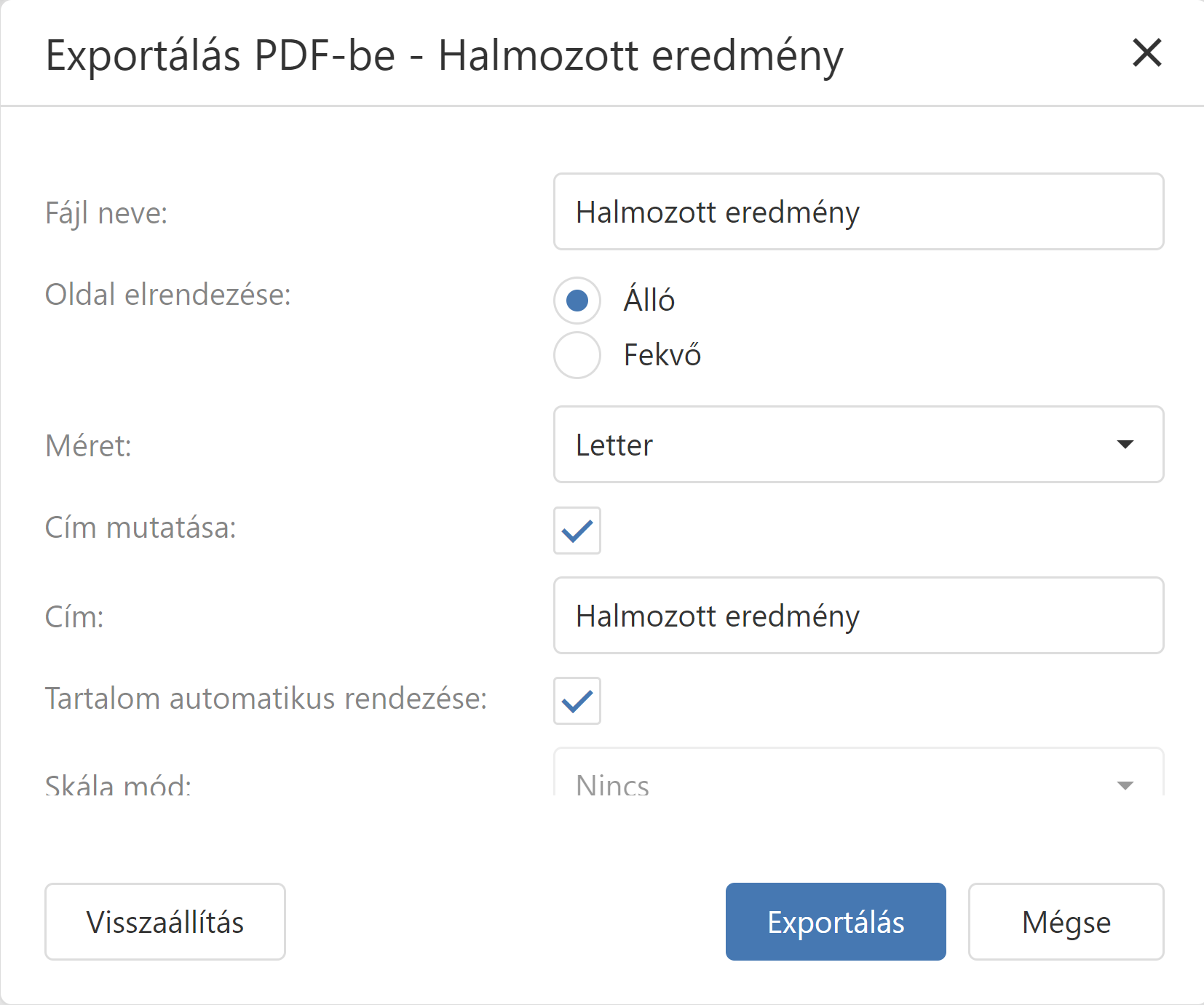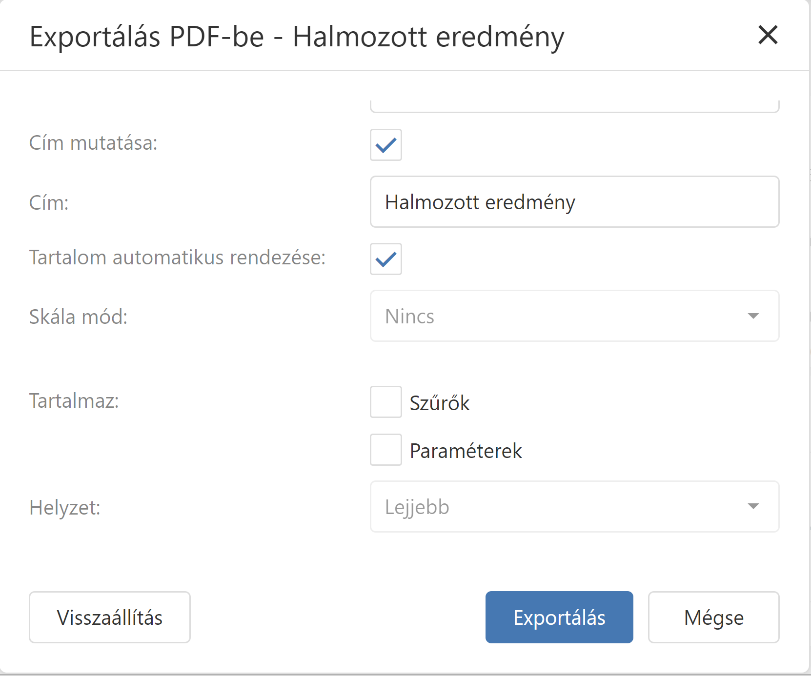 A szükséges paraméterek kiválasztása után az gombra kattintva exportálhatja a Műszert PDF fájlba. Az alapértelmezett értékek visszaállításához kattintson a gombra. |