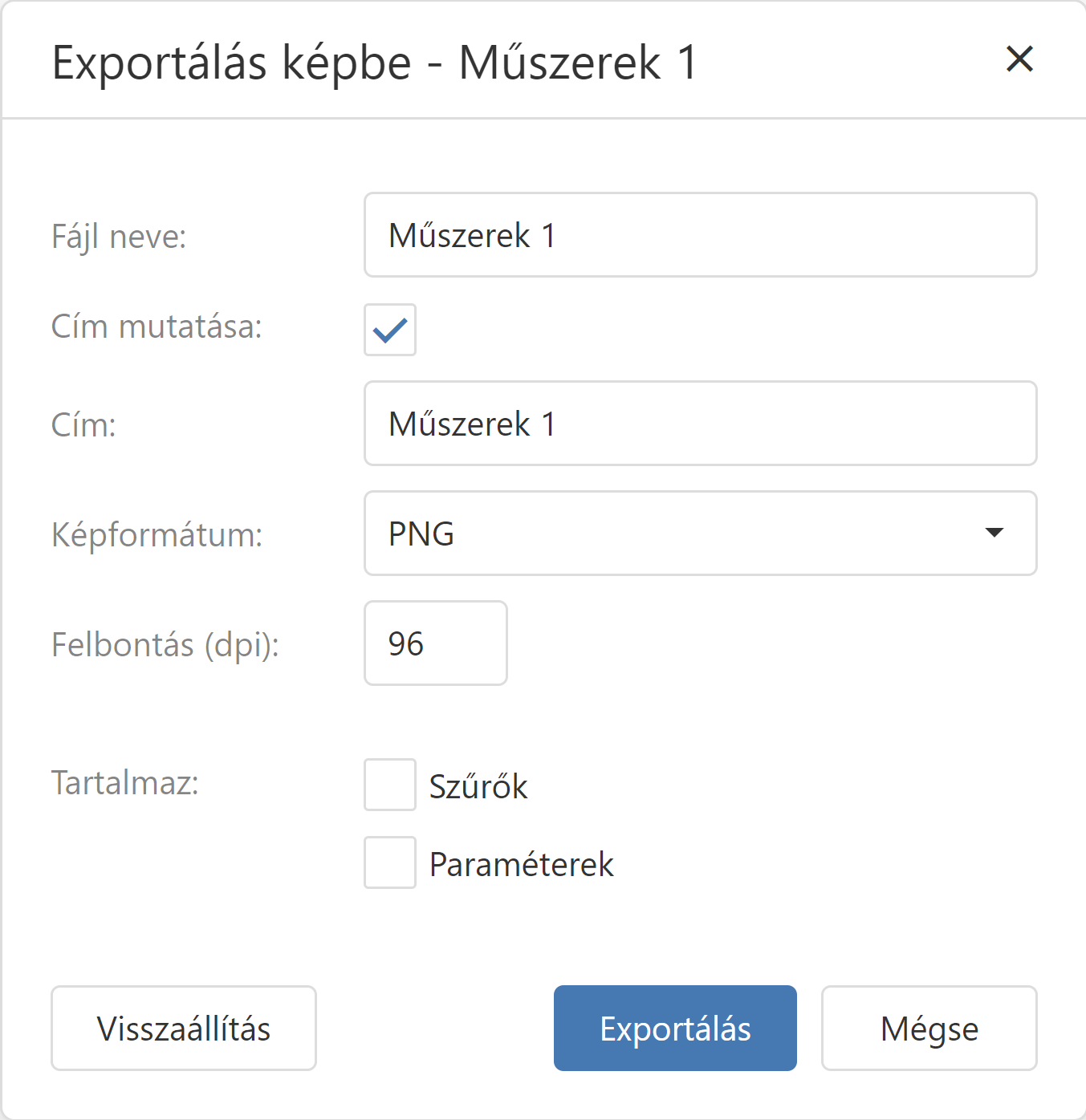 •Fájl neve - Adja meg az exportált kép fájl nevét. •Cím mutatása - Ha szeretné, hogy az exportált dokumentumban a Műszernek legyen címe, akkor tegyen pipát a kis négyzetbe. •Cím - Megadhatja az exportált dokumentum címét. Automatikusan megjeleníti a Műszer címét, de ezt itt módosíthatja. •Képformátum - Megadhatja azt a képformátumot, amelybe a Műszert exportáljuk. A következő formátumok állnak rendelkezésre: PNG, JPEG és GIF. •Felbontás (dpi) - Megadhatja a Műszer exportálásához használt felbontást (dpi-ben). •Tartalmaz | Szűrők - Lehetővé teszi, hogy főszűrő értékeket vegyen fel az exportált dokumentumba. •Tartalmaz | Paraméterek - Lehetővé teszi paraméterértékek felvételét az exportált dokumentumba.