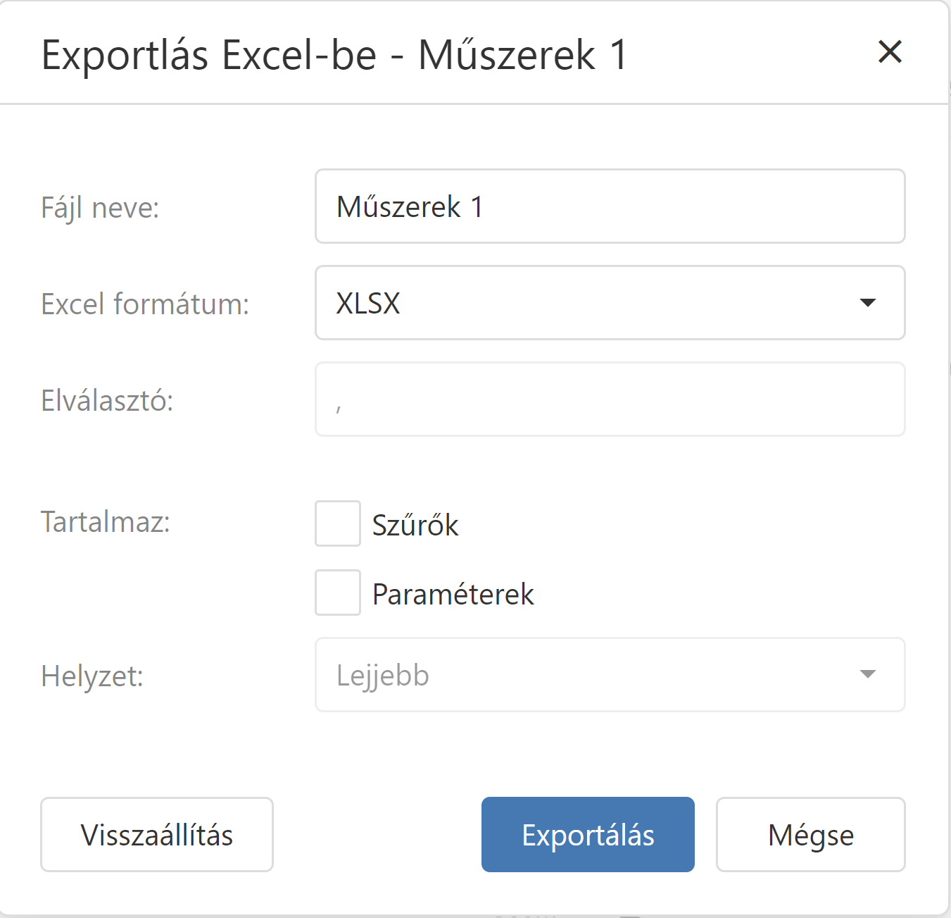 •Fájl neve - Adja meg az exportált Excel fájl nevét. •Excel formátum - Megadhatja az Excel munkafüzet formátumot, amelybe a Műszert adatait exportáljuk. Választhat az XLSX és az XLS formátumok között. •Elválasztó - CSV fájl esetén megadhatja, hogy milyen karakterrel legyenek elválasztva az értékek •Tartalmaz | Szűrők - Lehetővé teszi, hogy főszűrő értékeket vegyen fel az exportált dokumentumba. •Tartalmaz | Paraméterek - Lehetővé teszi paraméterértékek felvételét az exportált dokumentumba. •Helyzet - Megadhatja a Szűrők és a Paraméterek helyzetét az exportált dokumentumban. Választható Lejjebb és Külön oldal.