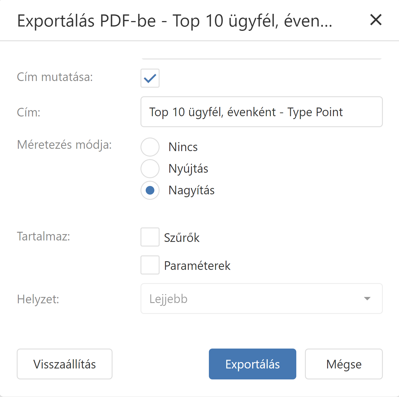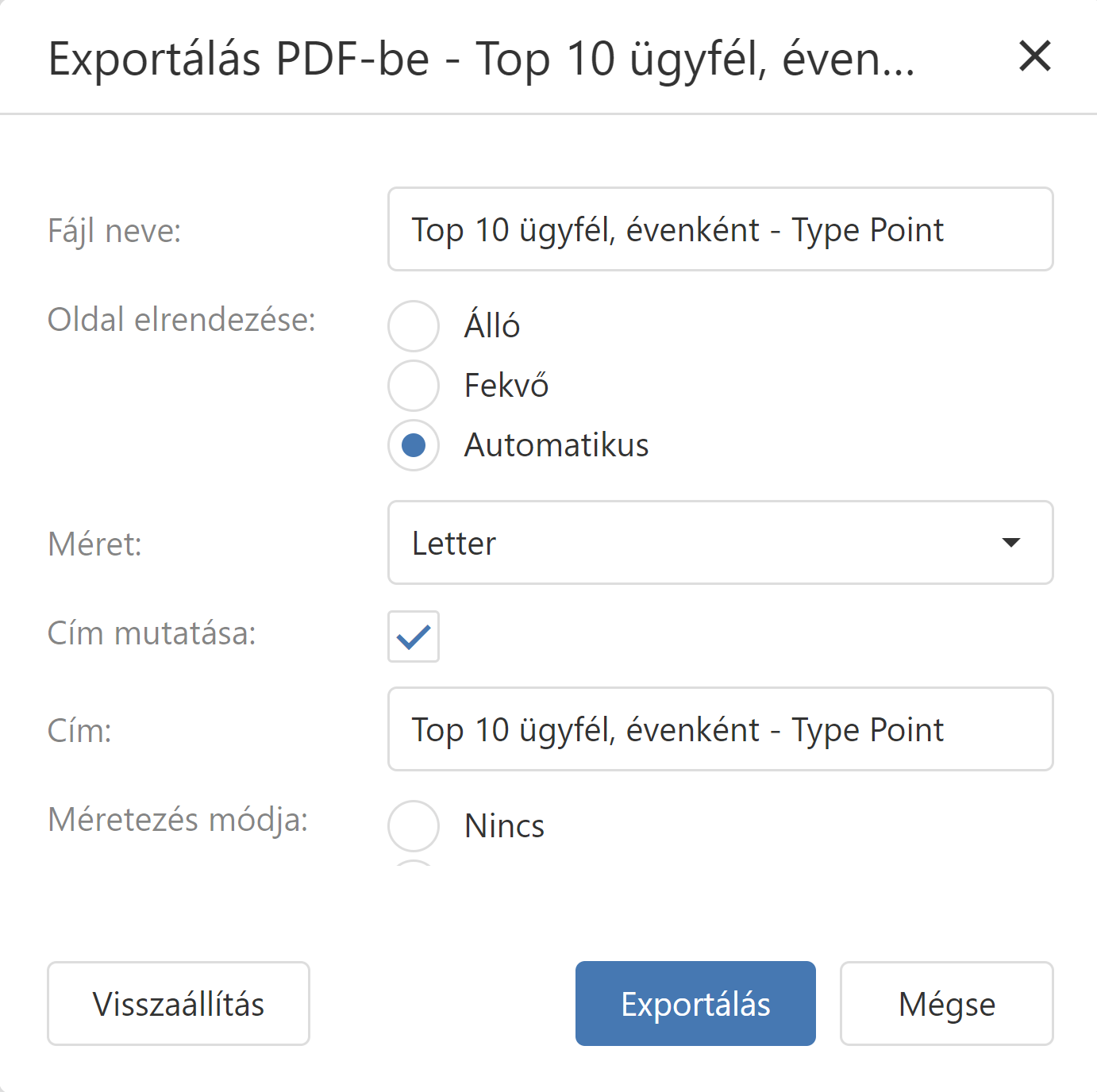 A szükséges paraméterek kiválasztása után az gombra kattintva exportálhatja a pontdiagramot PDF fájlba. Az alapértelmezett értékek visszaállításához kattintson a gombra. |