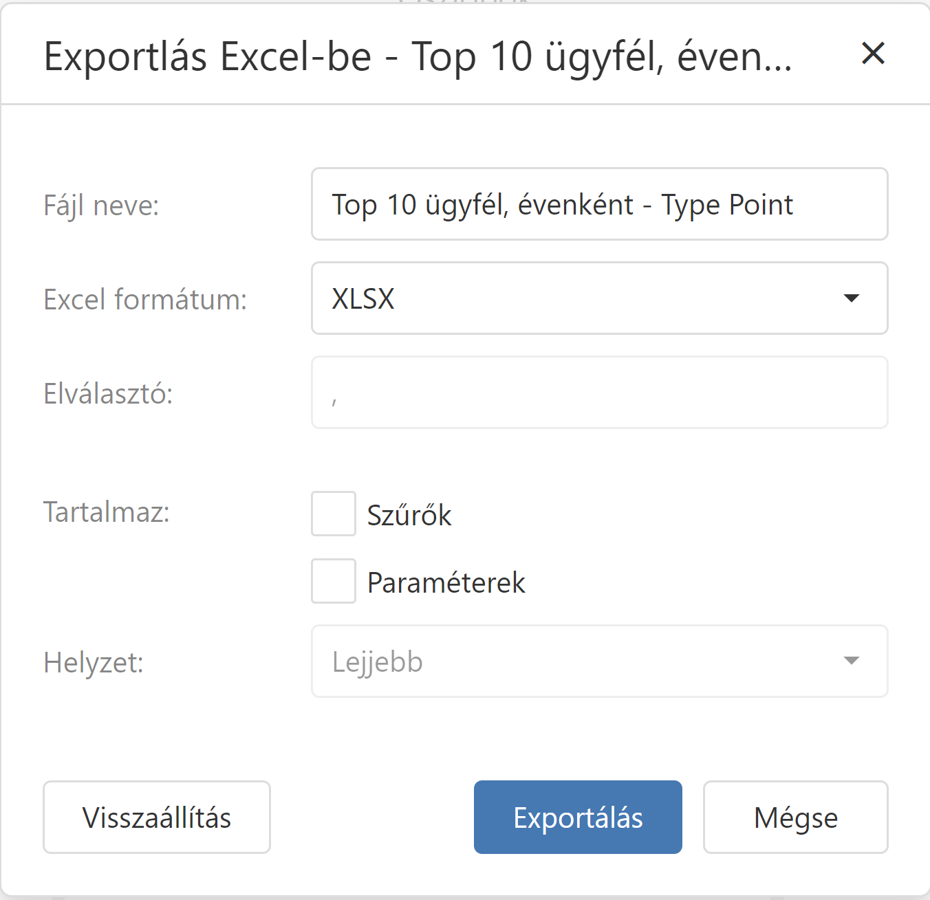 •Fájl neve - Adja meg az exportált Excel fájl nevét. •Excel formátum - Megadhatja az Excel munkafüzet formátumot, amelybe a pontdiagram adatait exportáljuk. Választható az XLSX és az XLS formátumok között. •Elválasztó - CSV fájl esetén megadhatja, hogy milyen karakterrel legyenek elválasztva az értékek •Tartalmaz | Szűrők - Lehetővé teszi, hogy főszűrő értékeket vegyen fel az exportált dokumentumba. •Tartalmaz | Paraméterek - Lehetővé teszi paraméterértékek felvételét az exportált dokumentumba. •Helyzet - Megadhatja a Szűrők és a Paraméterek helyzetét az exportált dokumentumban. Választható Lejjebb és Külön oldal.